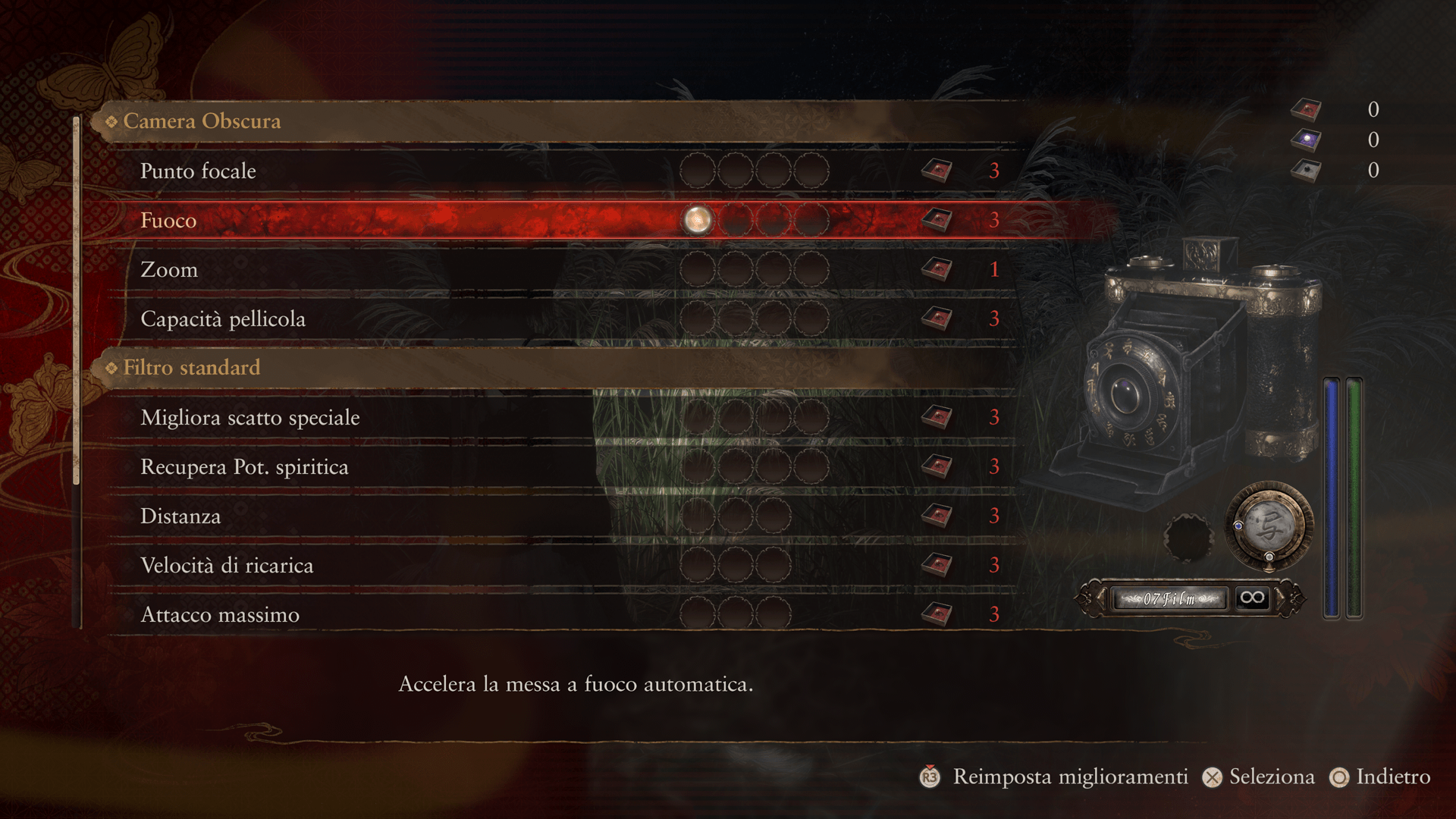 | Fuoco | Permette di regolare il fuoco in modo manuale. È possibile mettere a fuoco più velocemente rispetto al fuoco automatico e quindi infliggere danni più facilmente. Perle di rosario necessarie: 1 (prima volta) |