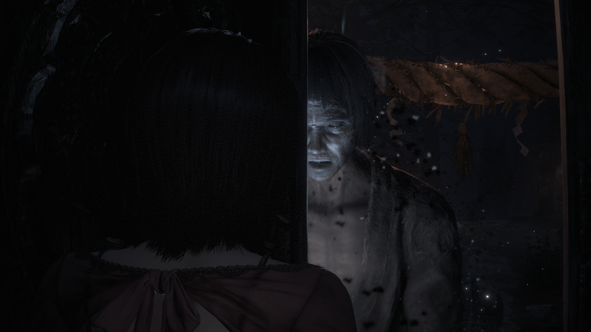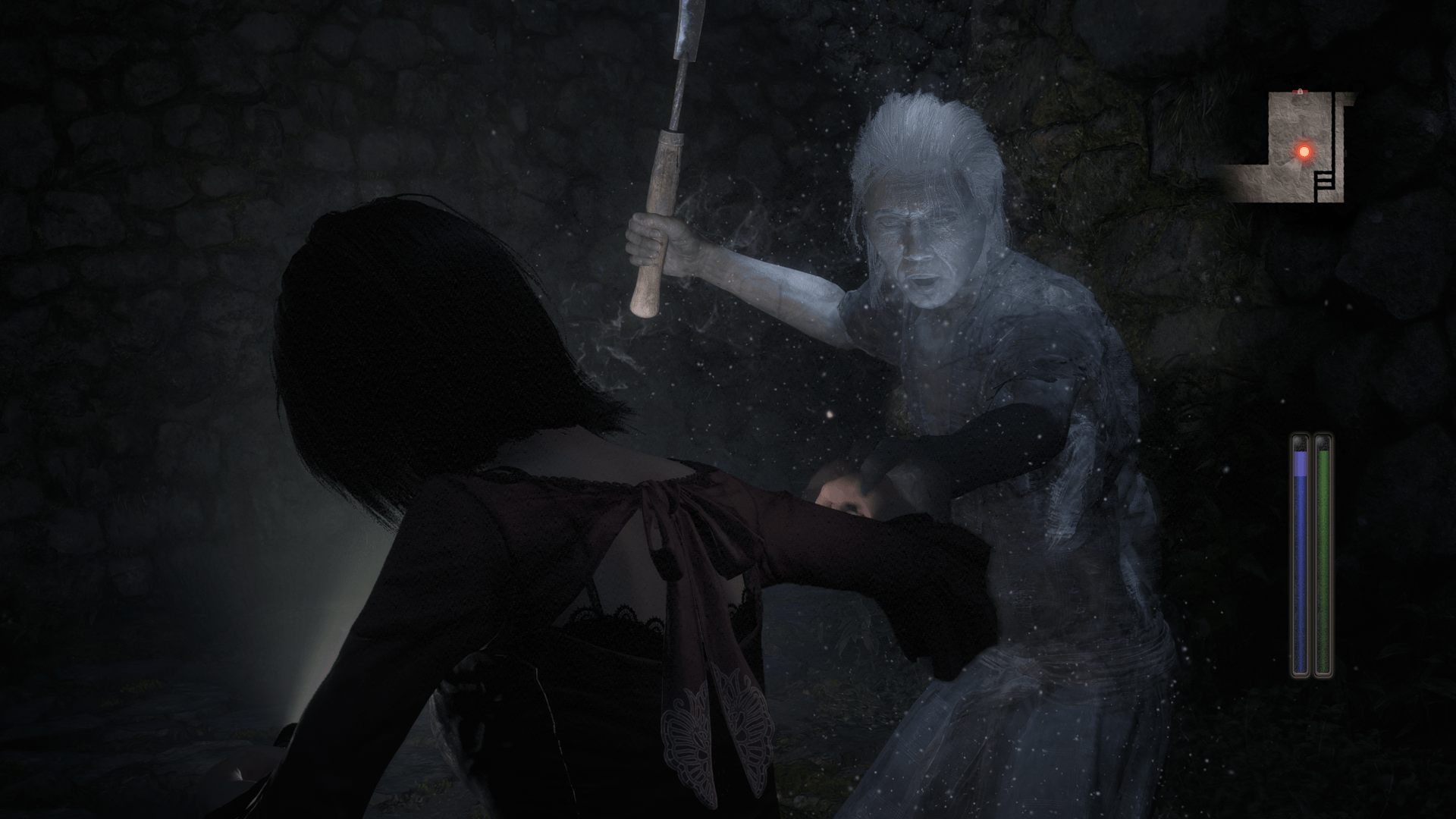 戦闘中、射影機を構えているときに、怨霊が主人公を睨むことがあります。怨霊と目があうと、霊力にダメージを受けます。また、扉を開けるときなど戦闘中以外でも怨霊に睨まれることがあります。