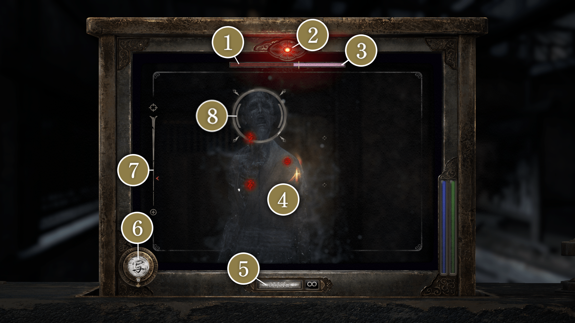 怨霊は赤色、浮遊霊は青色、特殊な撮影対象は各フィルターに対応した色に光ります。