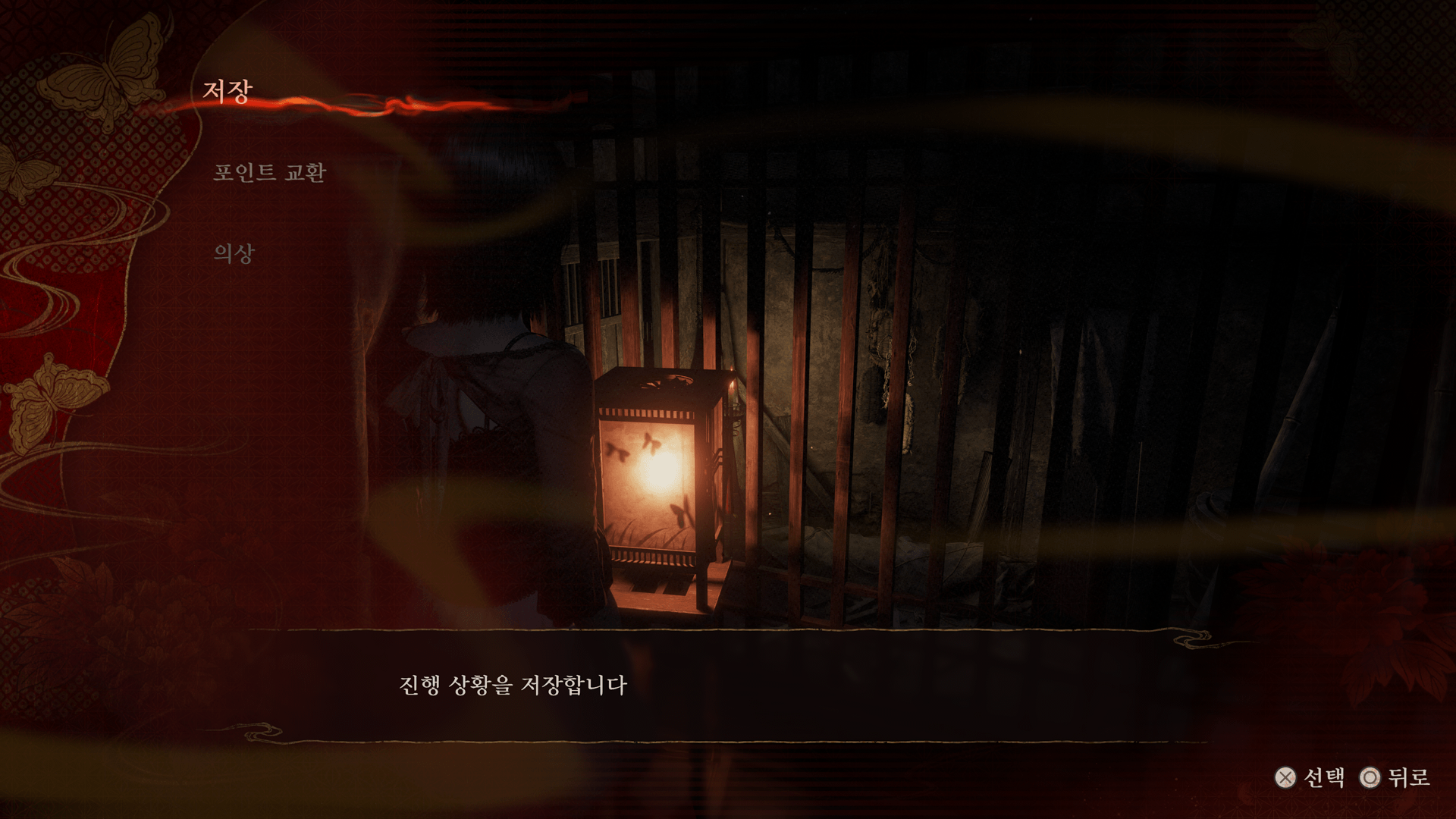 세이브 포인트(나비 등롱) 앞에서 버튼을 누르면 저장 화면이 표시됩니다.