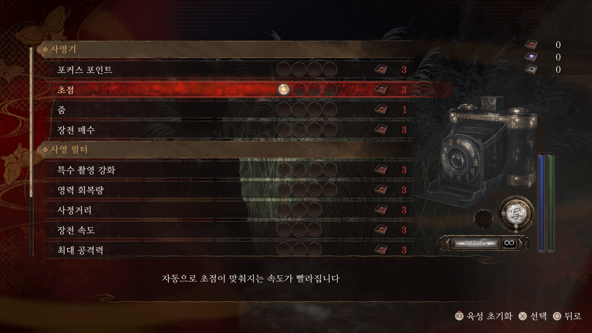 | 영시 | 촬영 가능한 거리(사정거리)가 긴 필터입니다. 특수 촬영 「암」: 촬영한 원령의 시야를 일정 시간 차단합니다. |