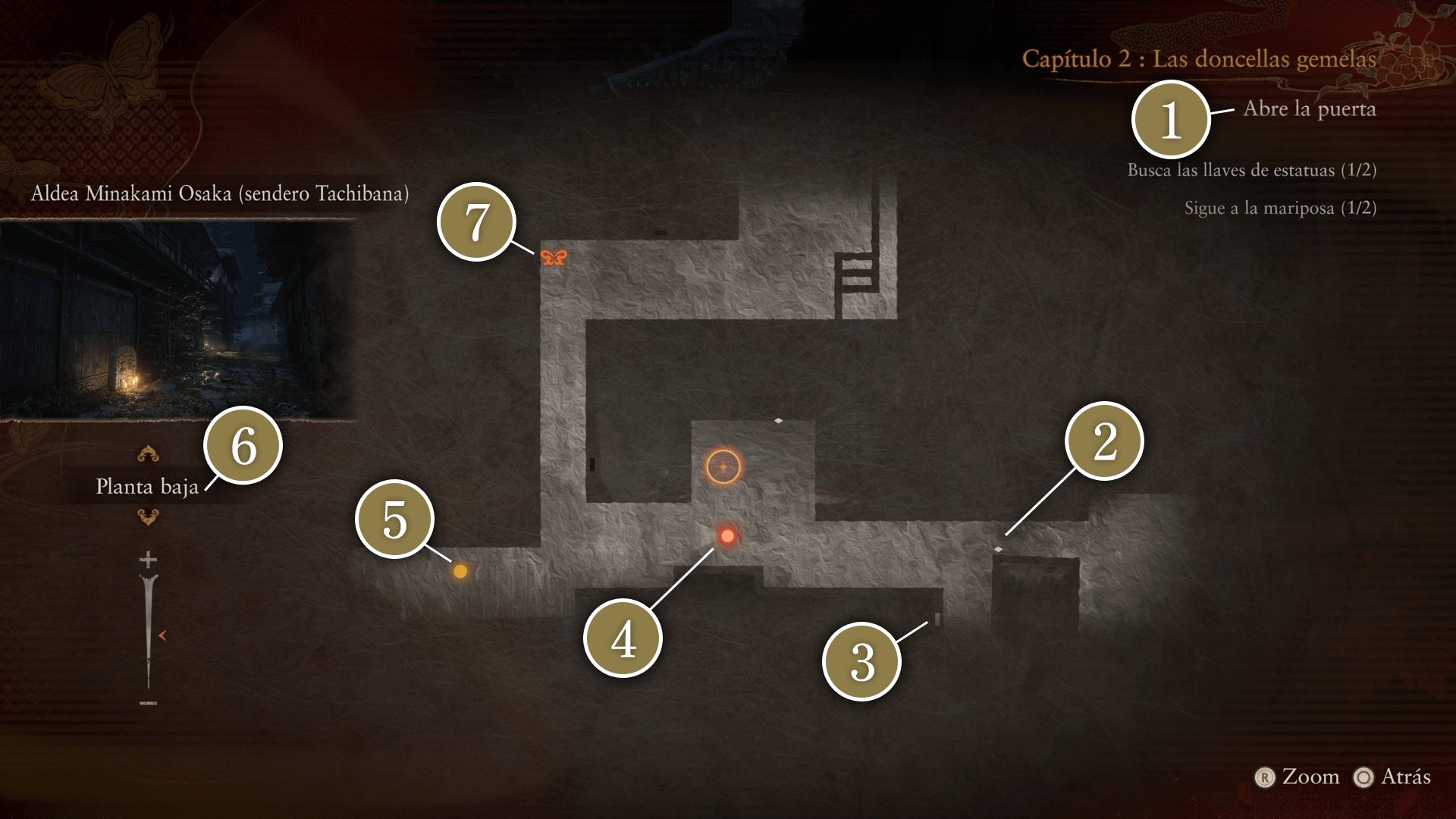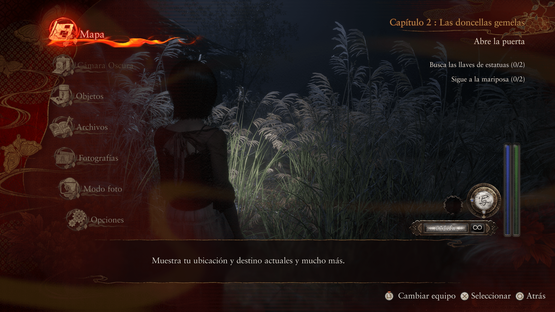 Desde el menú, puedes acceder al mapa y a otra información, mejorar la Cámara Oscura y realizar otras acciones.