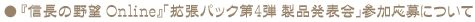 『信長の野望 Online』開発チームでは、現在「争覇の章」に続く拡張パックを鋭意制作中です。この度、その内容を皆様にお知らせする機会として『信長の野望 Online』「拡張パック第4弾 製品発表会」を開催する運びとなりました。