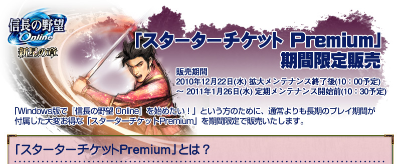 | 販売期間 | 2010年12月22日(水) 拡大メンテナンス終了後(10:00予定) 〜 2011年1月26日(水) 定期メンテナンス開始前(10:30予定) |