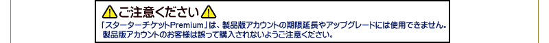 | 注意事項 | ■ 「スターターチケットPremium」は、製品版アカウントの期限延長やアップグレードには使用できません。 ■ 本チケットは、ハンゲームIDの無料体験版アカウントには利用できません。 ■ 適用先アカウントにご注意ください。 無料体験版アカウントとネットカフェアカウントの双方をご登録いただいている場合は、あらかじめチケットを適用する “アカウントID”をアカウント一覧にてご確認の上、お手続きを進めてください。チケット適用後は、適用先アカウントの 変更等はできません。ご注意ください。 >> 購入履歴:チケットの購入履歴をご確認いただけます >> アカウント一覧:チケットの適用が正しくなされているかをご確認いただけます ■ コンビニ決済にてチケットを購入された方は、アカウントへの適用が必要です。 >> チケットをアカウントに適用する ■ 付属のプレイ期間終了後も継続してプレイされる場合、「30日間プレイチケット」(1,260円[税込])の購入・適用が必要です。 |