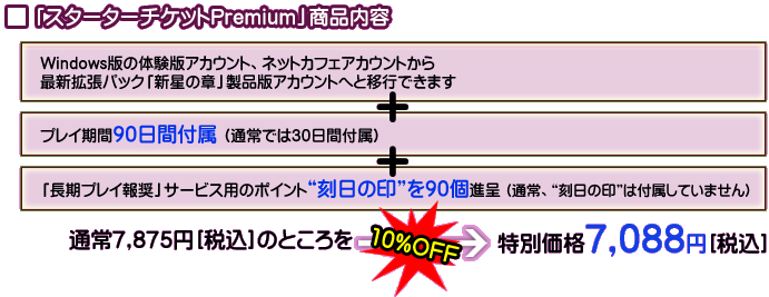 | 商品概要 | ■ Windows版の無料体験版アカウント及び、ネットカフェアカウントに適用すると、最新拡張パック「新星の章」を含む Windows版の製品版アカウントへ移行できます。 ■ アカウント有効期限は90日間分延長されます。 ■ 「長期プレイ報奨」サービス用のポイント“刻日の印”を90個獲得できます。 |