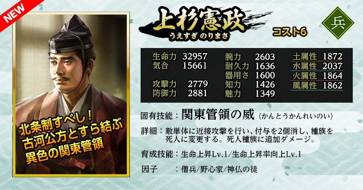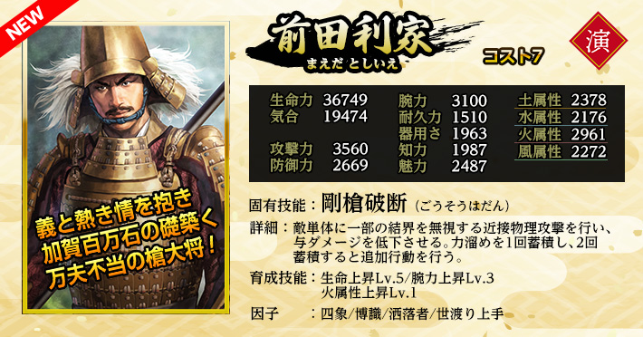 使用することで「英傑」を仲間にできる。 《英傑の招喚鈴・さ》の英傑に加え、英傑《前田利家・雄材》《安国寺恵瓊》《上杉憲政》が登場する。 入手済みの英傑が重複した場合、入手の代わりに限界突破が発生します。限界突破は最大4回で、以降は等級に応じた「英傑の零力」が手に入ります。 |