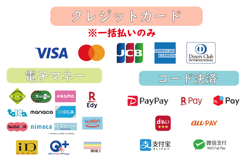 お支払いに関しましては、現金以外に以下がご利用いただけます。