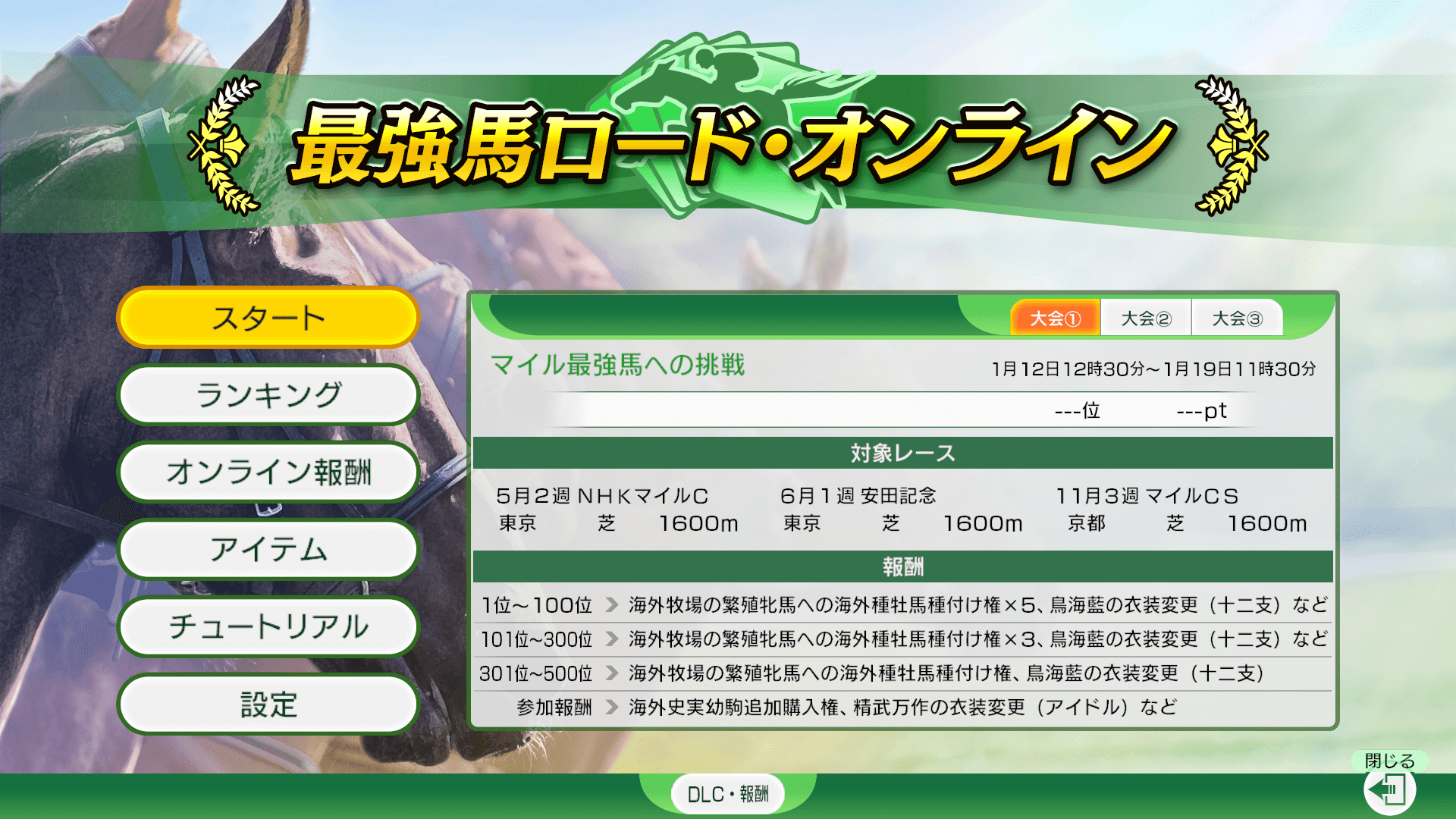 ダウンロードコンテンツの購入や確認、オンライン対戦やオンライン・馬券王決定戦で獲得した報酬の確認を行います。