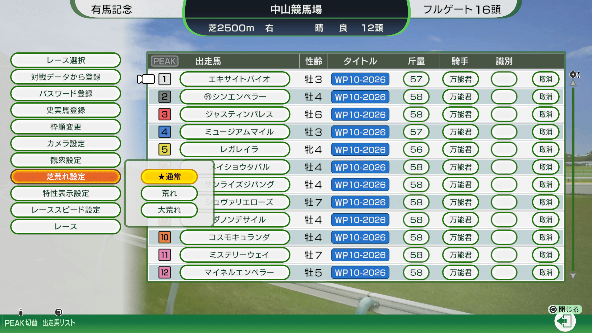 PEAK切替をオンにすると、対戦馬が実力を十分に発揮できるよう、全馬の成長度、気合乗り、調子、疲労などのパラメータを理想の状態に切り替えます。
