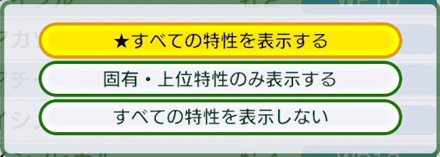 レース中に表示する特性を設定します。「表示馬」で特定の馬の特性のみを表示、「表示種類」で特定の種類の特性のみを表示することもできます。