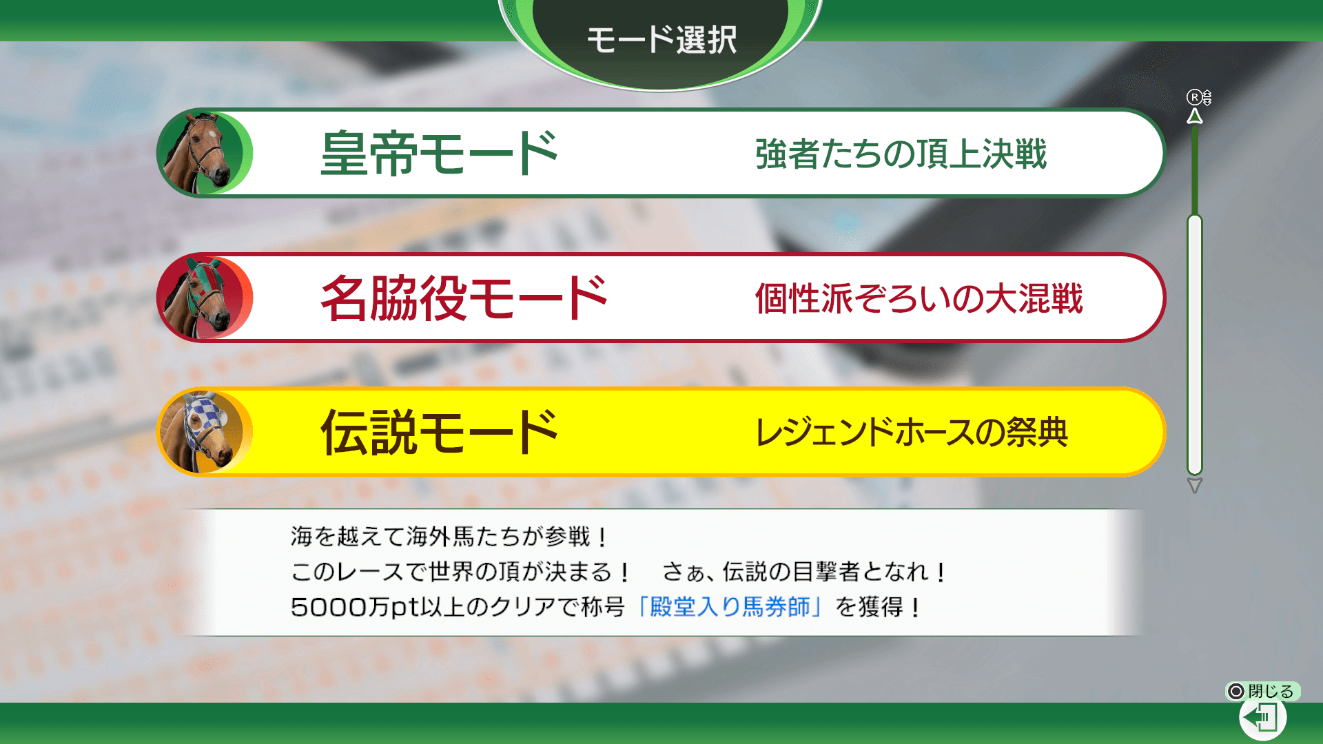 名馬カードを集めて最強の愛馬を育成し、レースを楽しむモードです。