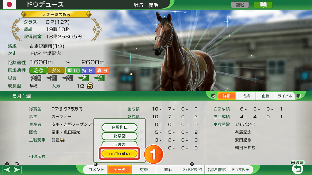 競走馬情報の画面で「データ」→「netkeiba」