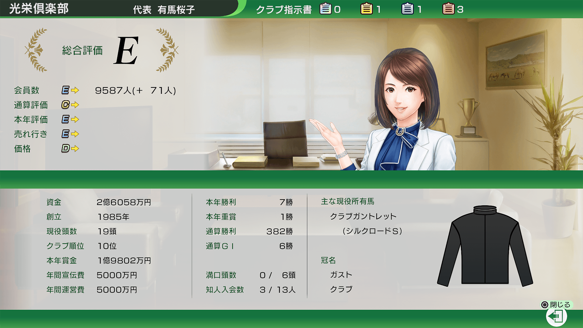 「クラブ」→「情報」から見られる情報画面では、会員数・通算評価・本年評価・売れ行き・価格の5つの基準点から、総合評価(S>A>B>C>D>E)の判定が表示されます。高評価を獲得すると、「クラブ指示書」を入手できます。また、成績上位厩舎への入厩が可能になることもあります。