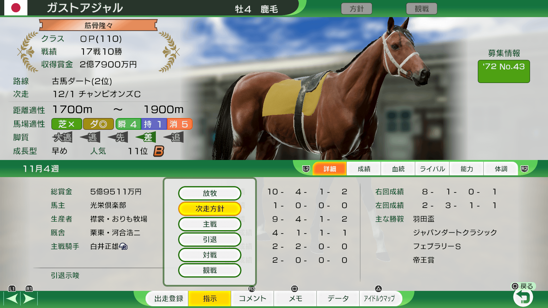 「クラブ」→「募集馬」「現役活躍馬」からクラブ所有馬の出走登録(ローテーション設定を含む)、次走方針、主戦騎手、引退、観戦の設定や対戦データの登録ができます。