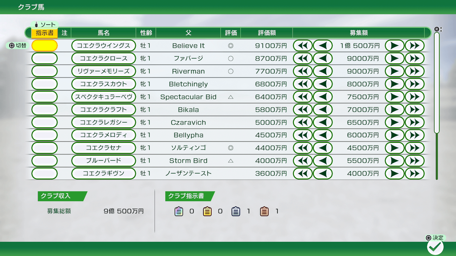 またクラブ指示書を、1頭につき1枚のみセットできます。クラブ指示書をセットした馬は、能力のいずれかが特別に上がることがあり、クラブの評価アップを期待できます。
