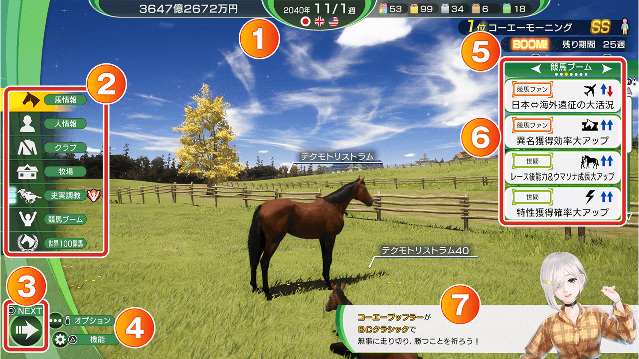 | 競馬ブーム | 発生中の競馬ブームの効果を確認できる。競馬ブーム中のみ表示される。 |