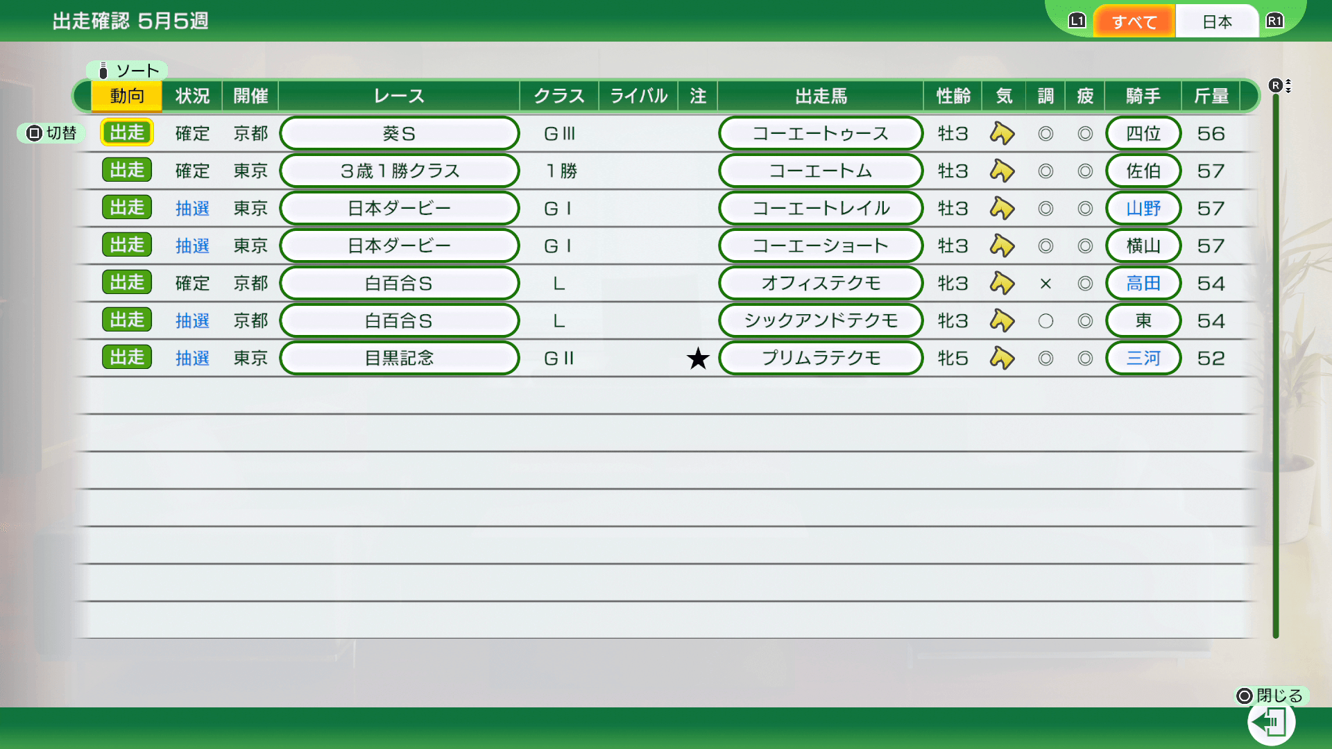 所有競走馬がレースに出走する週に表示されます。「動向」タブを切り替えると、出走を回避できます。