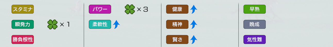 インブリードが成立し、インブリード対象の先祖馬が特定の因子を持っていると、早熟、晩成、気性難に〇が表示されます。