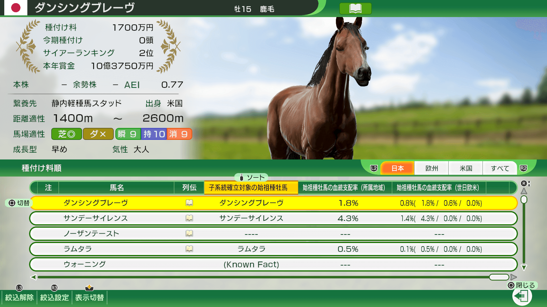 種付け時の種牡馬リストや、「馬情報」→「所有種牡馬」「種牡馬」のリスト、オプションコマンドの「配合」→「系統情報」のリストから、系統確立対象の種牡馬とその血統支配率を確認できます。