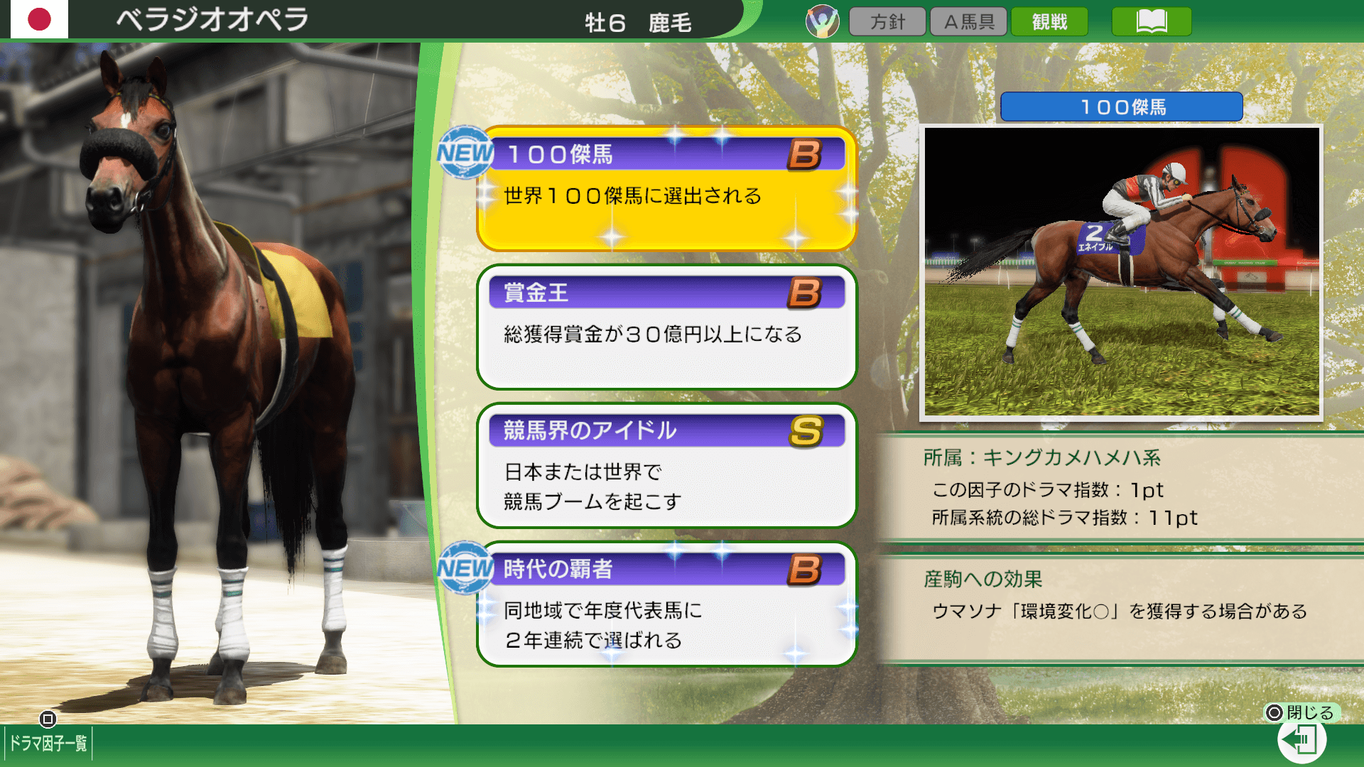 馬のドラマチックな活躍を数字で表したものです。ドラマ因子を獲得する、もしくは活性化させると、その馬や所属する子系統のドラマ指数が増加します。