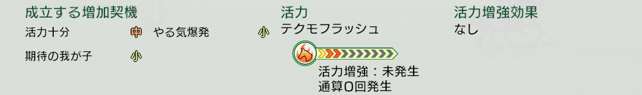 活力の増加量は小、中、大、特大、永続の5段階があります。ゲージ上で黄色で表示される小、中、大、特大の通常の活力は、活力増強状態で受胎すると0になりますが、緑色で表示される永続的な活力は受胎しても残り続けます。