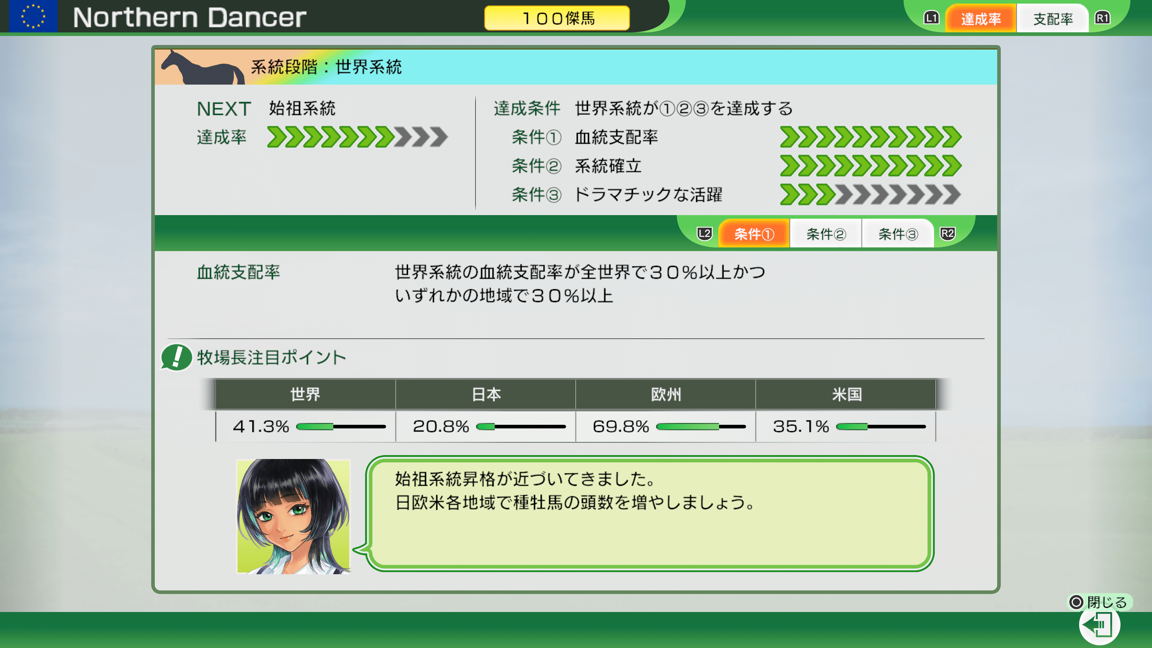 また、親系統として世界中で勢力を広げていくと、さらにその上の世界系統に昇格することがあります。世界系統に昇格すると、大種牡馬因子が世界種牡馬因子になり配合理論に与える効果が親系統以上に大きくなるほか、子孫の適応能力が全体的に上昇します。