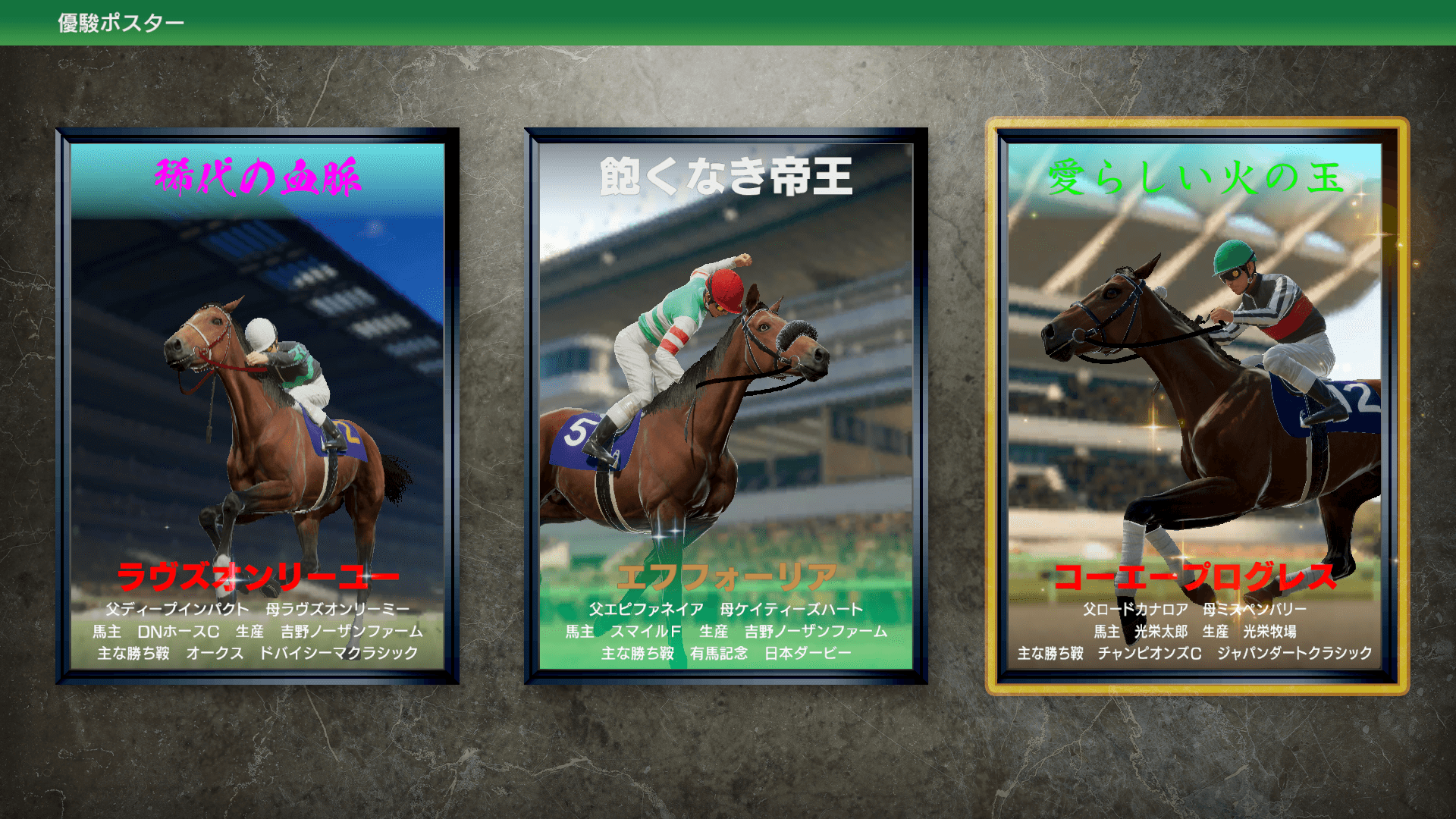 活躍した競走馬が引退すると優駿ポスターが飾られ、鑑賞や編集ができるようになります。