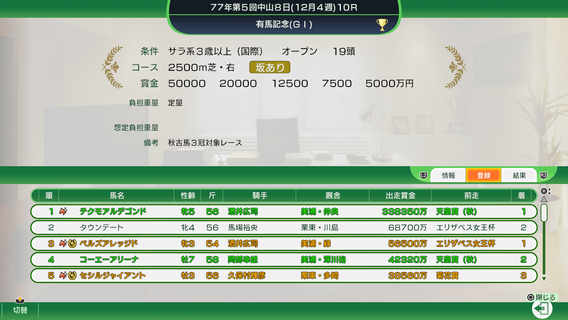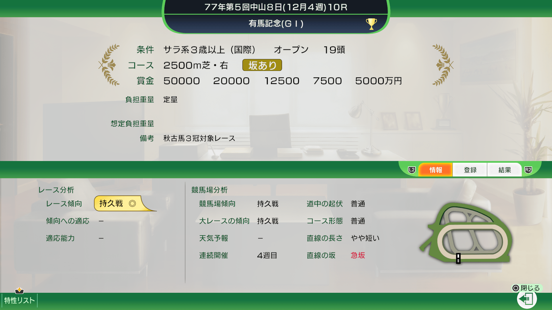 レースを選ぶと、詳細な情報が表示されます。登録条件、コース、賞金などの情報を確認できます。