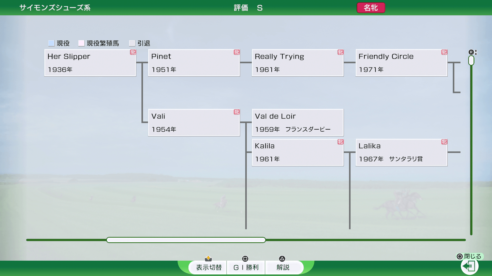 牝系のリストを見ます。「名牝」に「〇」がついている牝系の馬を配合すると、配合時の爆発力が増えます。また牝系には様々な特性がつきます。牝系のリストから牝系を選ぶと、詳しい牝系図が表示されます。