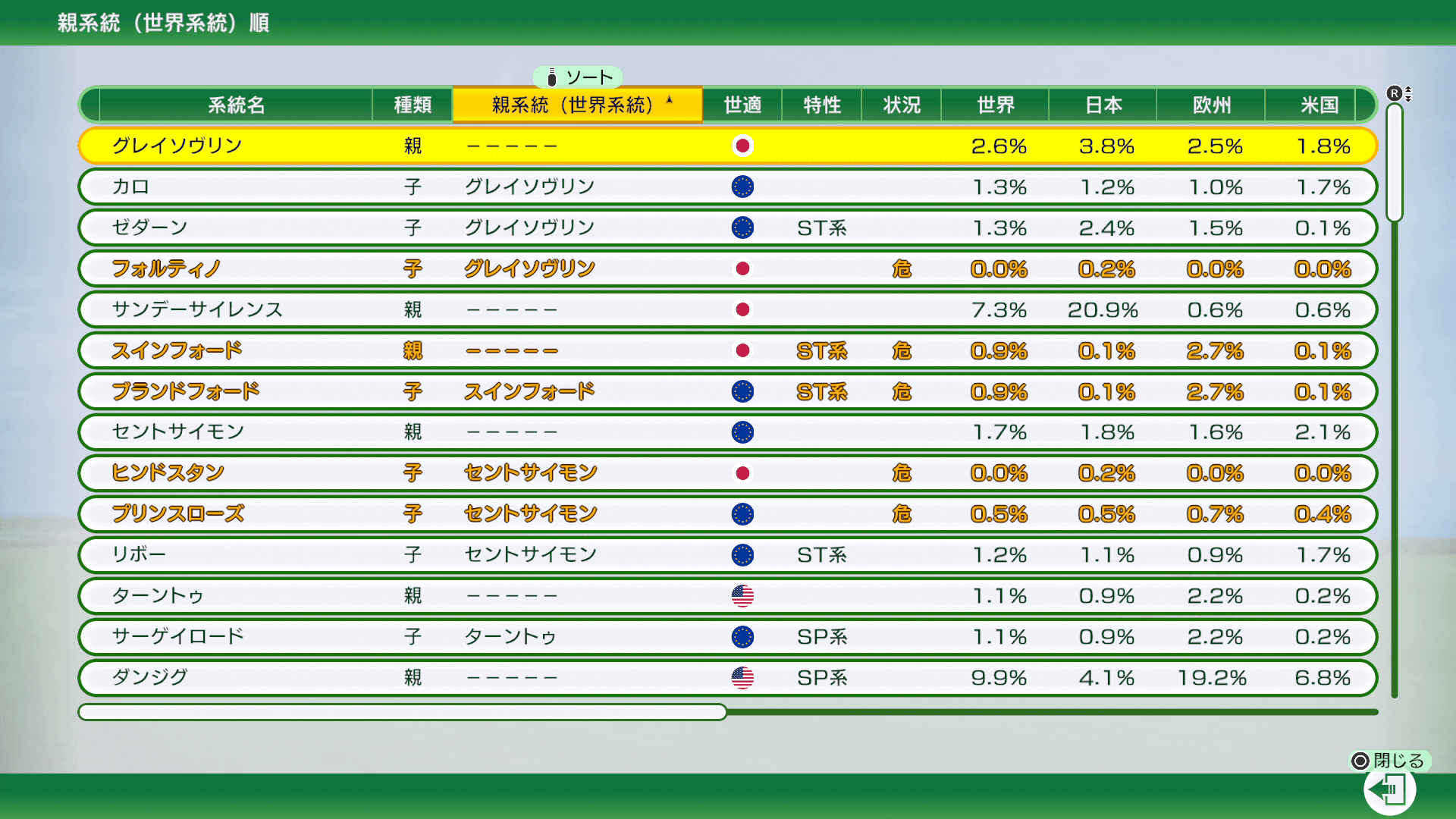 表示される情報は、表を見た時点のもので、1年ごとにリセットされます。その年に流行っている子系統や、勝利している血統の傾向などが確認できます。産駒への影響や海外遠征を考える際にチェックしておくとよいでしょう。