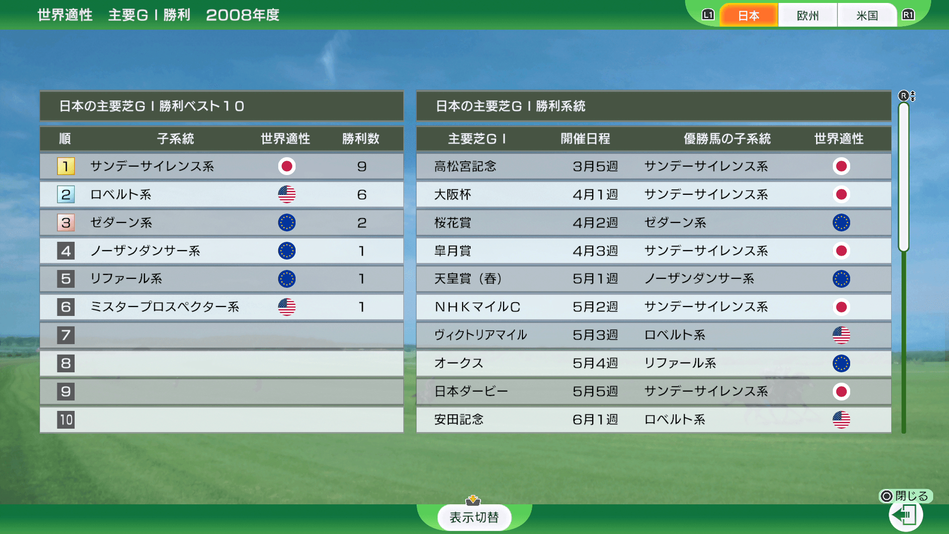 世界各国の芝GⅠを制した子系統のベスト10や、勝利系統(表示切替で優勝した馬)を見ます。