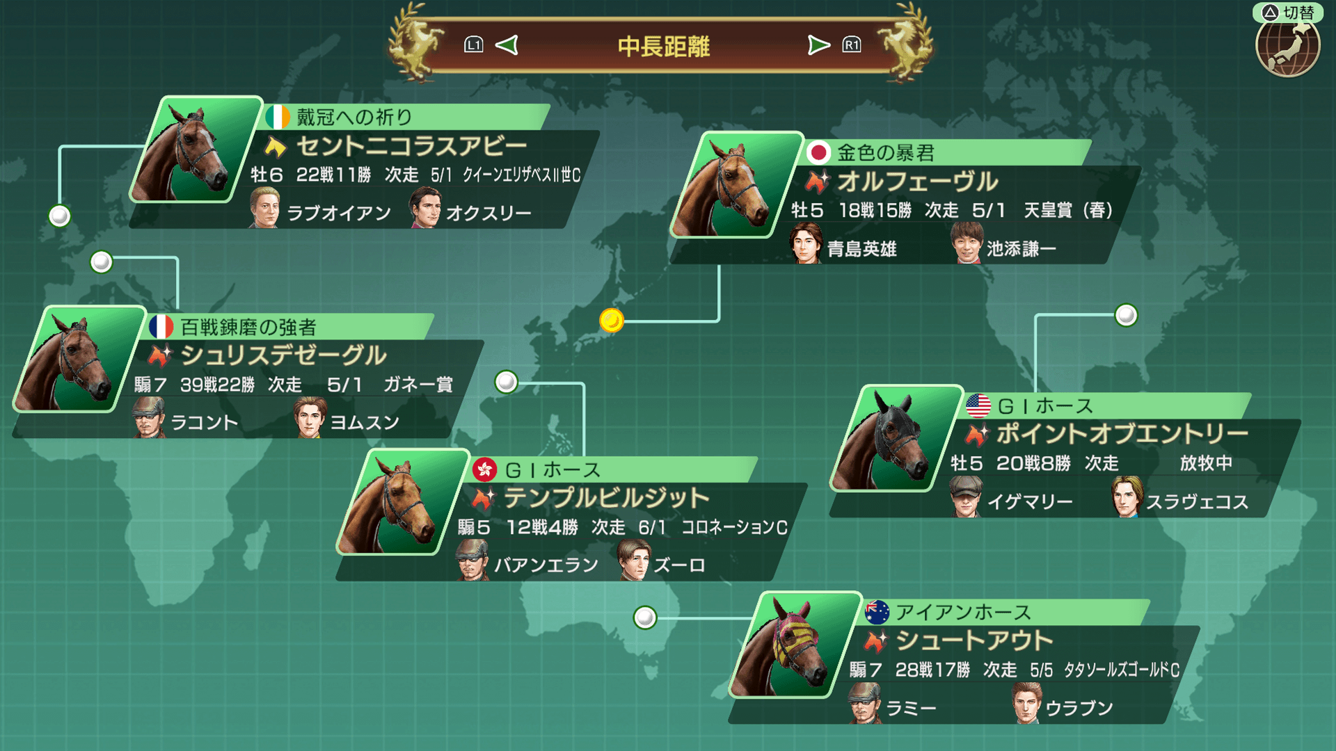世界や日本における有力馬の情報、次走の予定、管理調教師や主戦騎手を確認できます。
