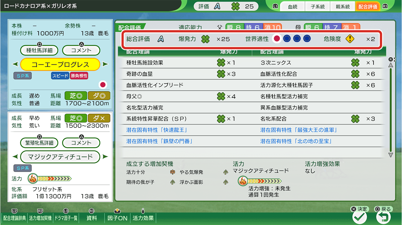 総合評価は産駒がどれだけの合計能力を持つ可能性があるのかっていう評価で、S>A>B>C>Dの順で高いよ