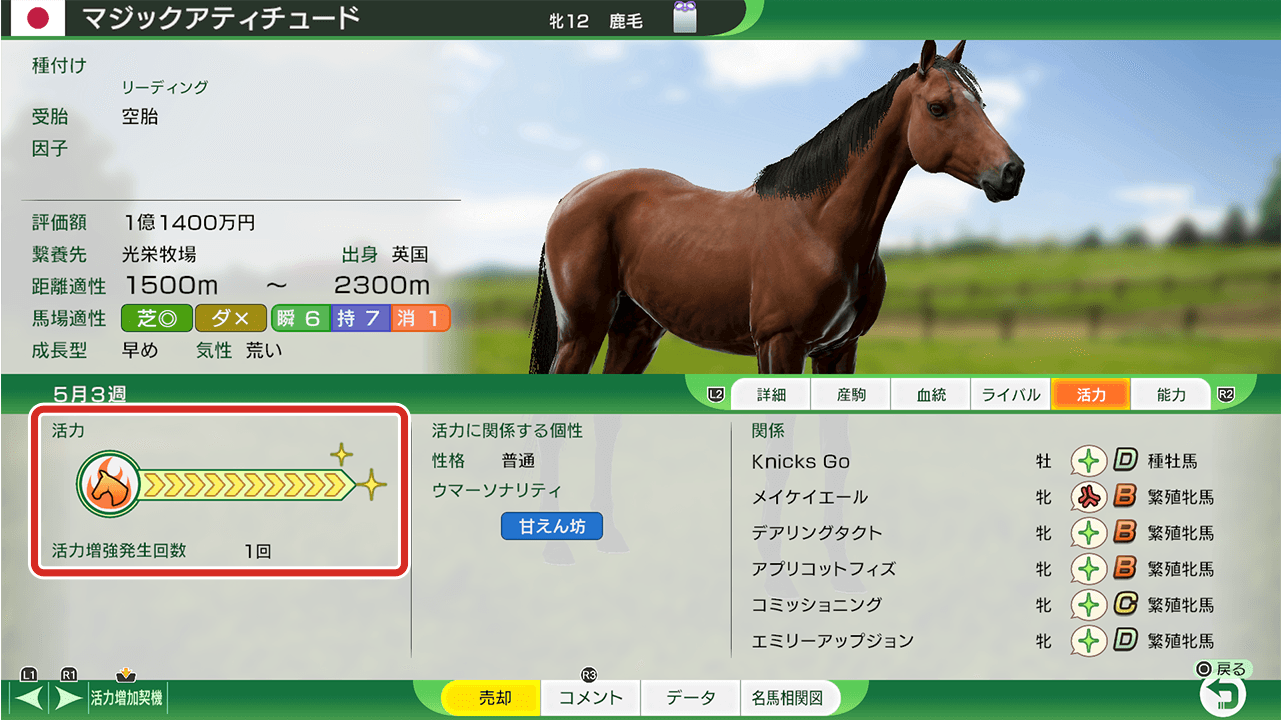 種付けする種牡馬を選ぶときに、活力の増加量でソートすることもできるよ