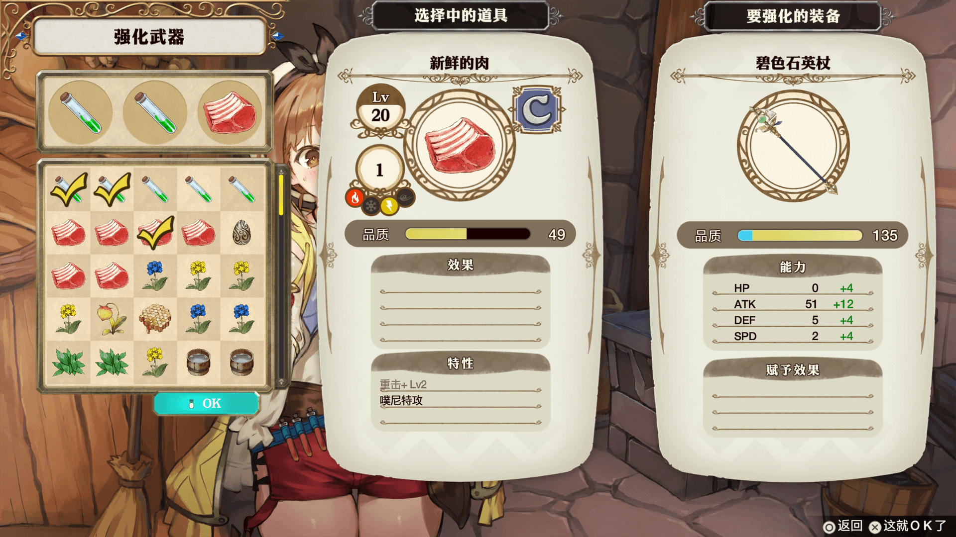 把材料放入持有的武器之中就可以强化武器。根据放入的材料不同,强化的状态也会有所不同。另外,还能继承作为材料的道具拥有的特性。使用不同的道具作为材料,可以向武器附加特殊的效果。每把武器都仅有1次强化机会。