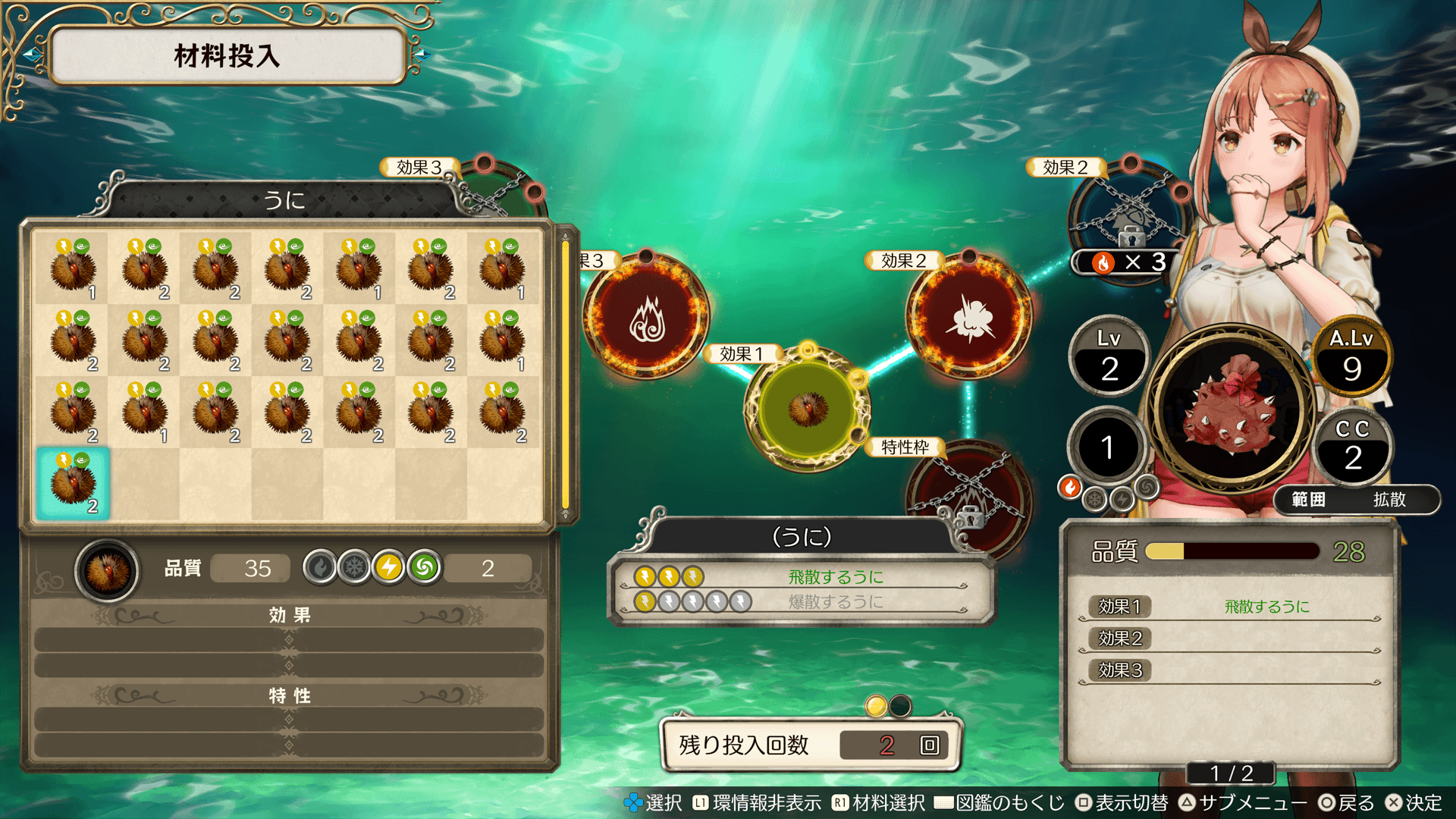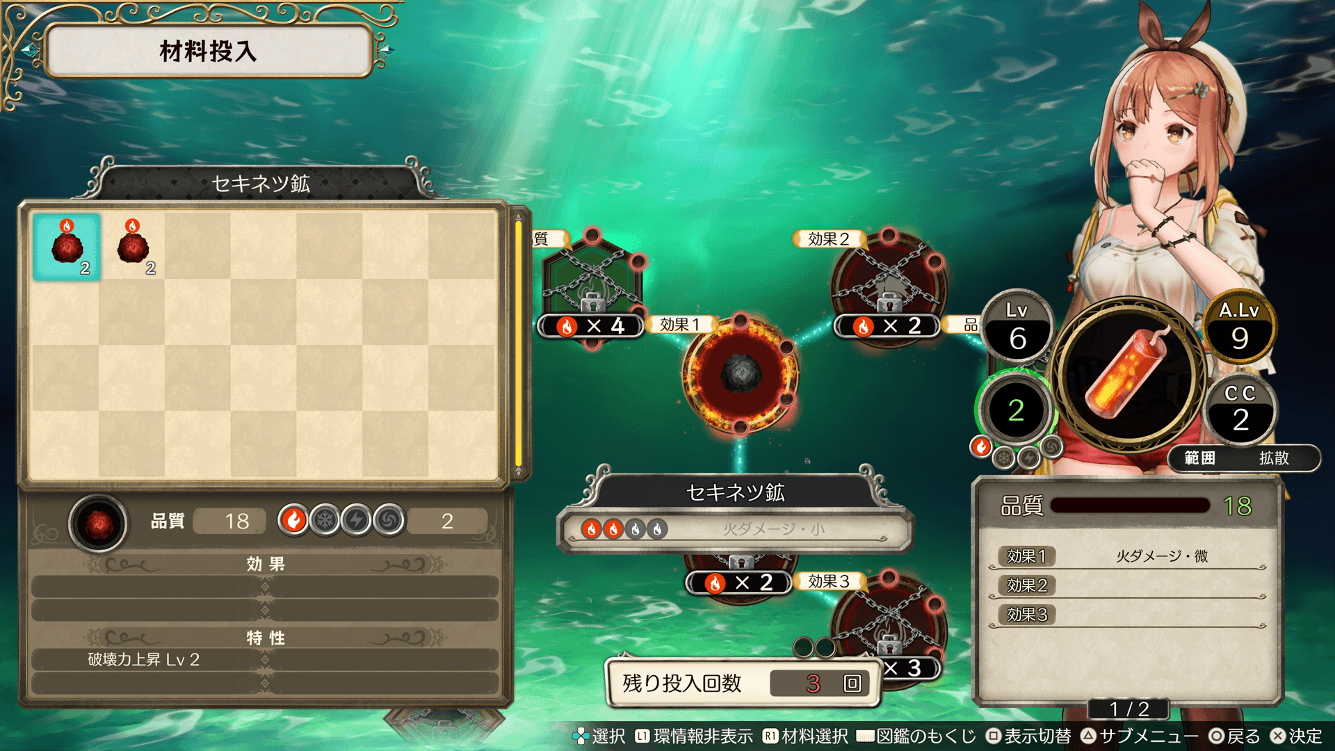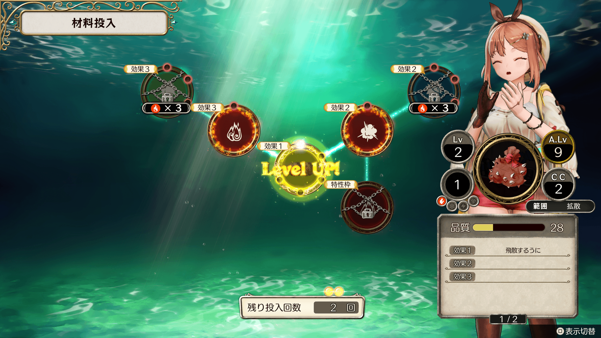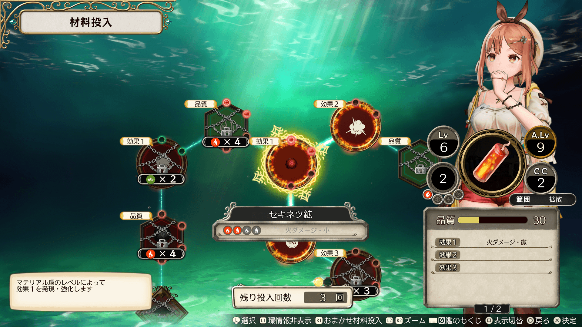 マテリアル環に、決められた回数だけ対応する材料を投入すると、調合ができます。