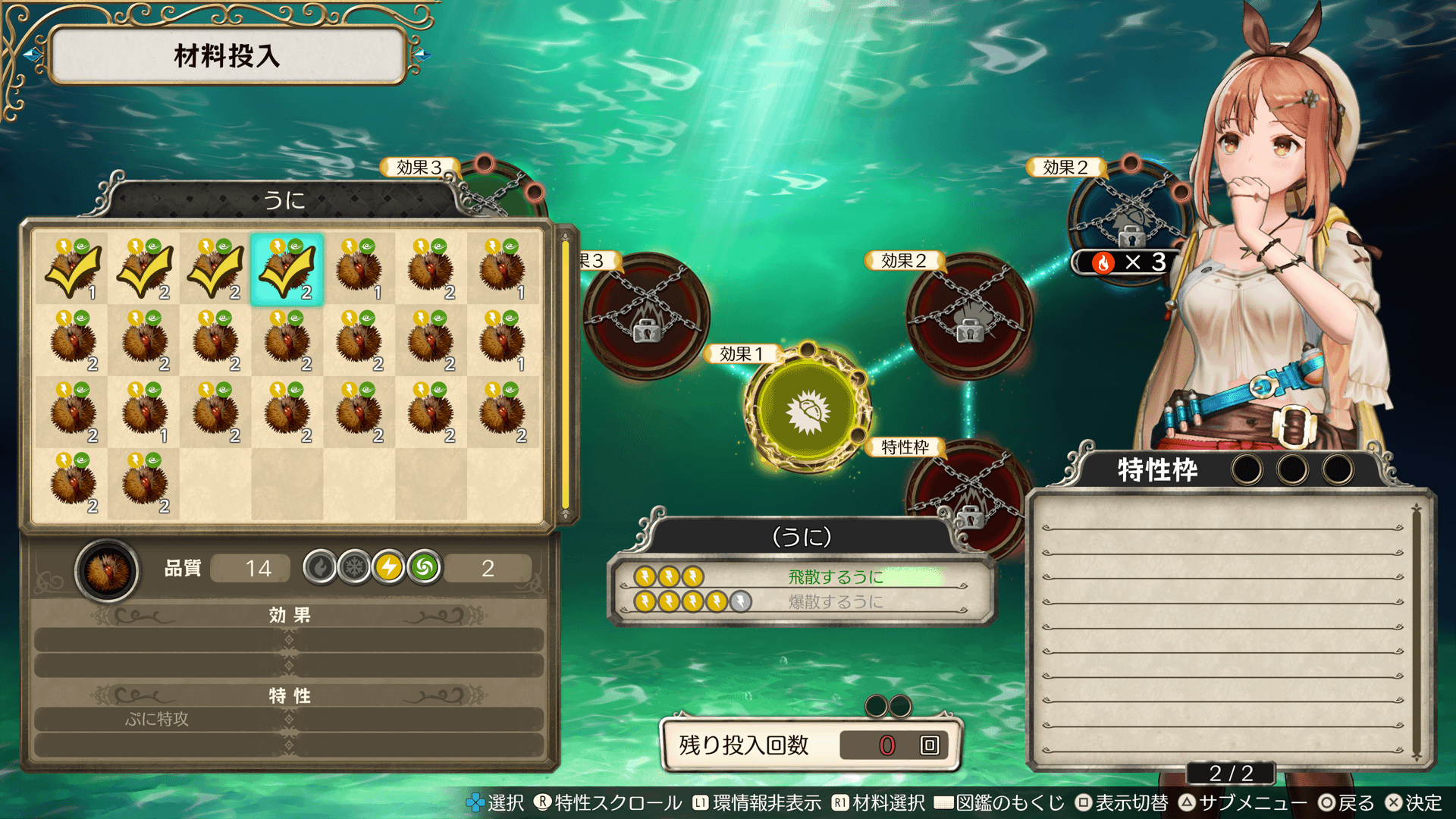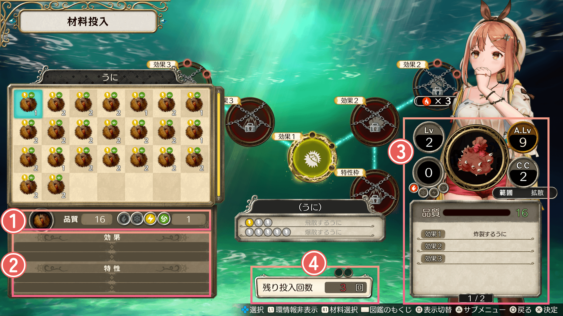 上部の円の数は、調合に必要な最低材料数です。この円がすべて黄色になると、投入回数が残っていても調合できます。