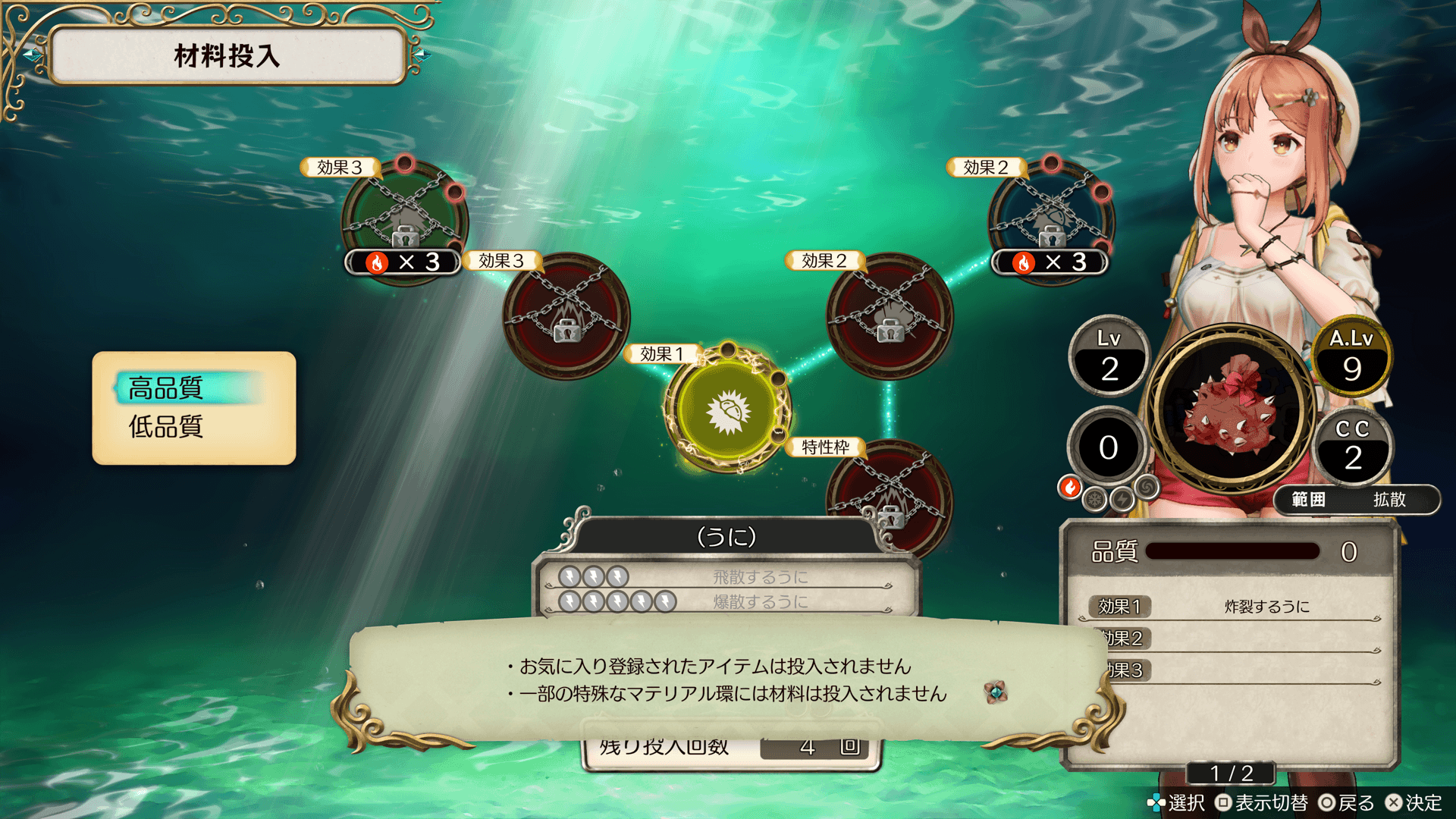 「高品質」「低品質」のどちらを優先してアイテムを投入するか選択します。