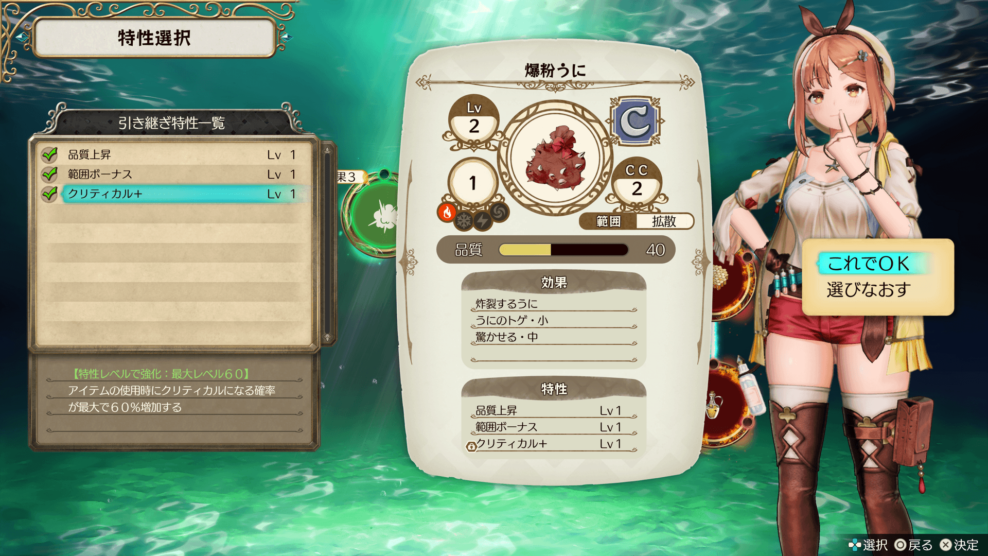 選択中の材料の効果・特性です。アイテムの品質を上げたり、特性を引き継いだりできます。