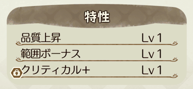 アイテムが持つ属性と、その値です。投入する材料の品質などが高いほど、値が高くなります。