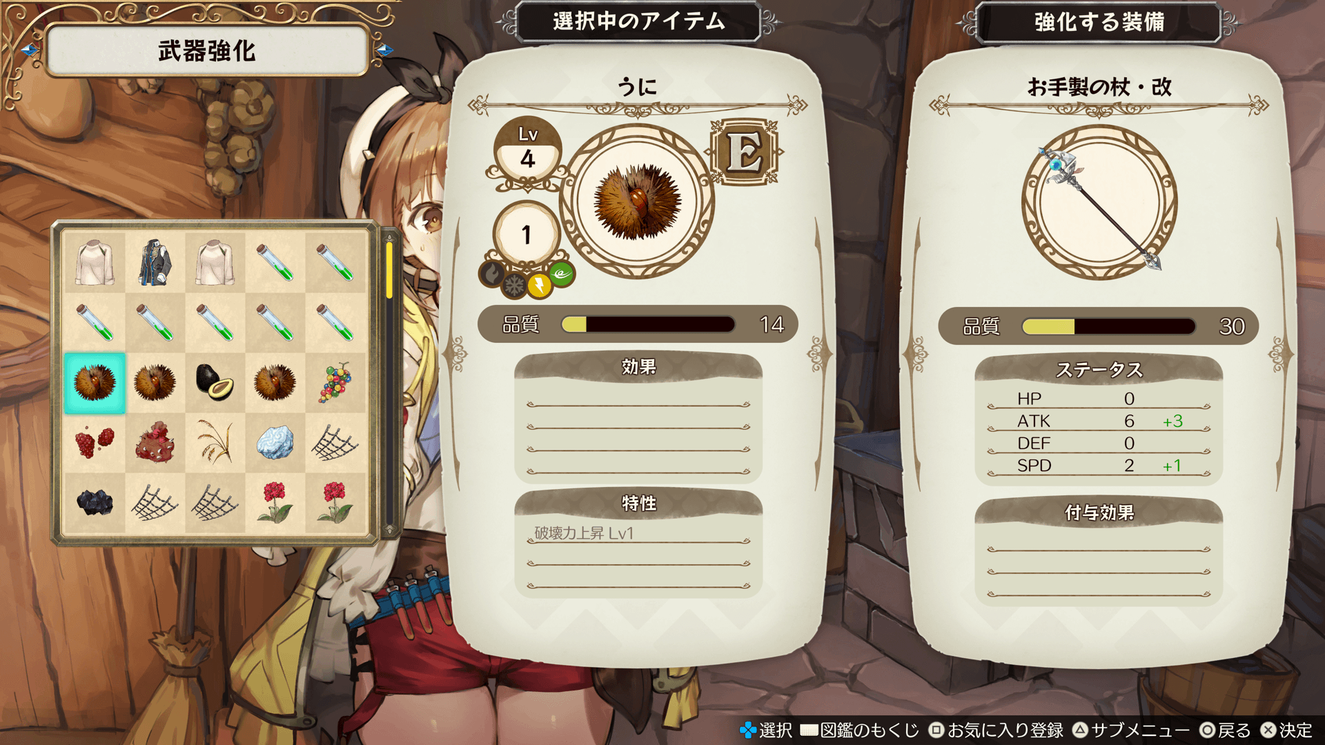 所持している武器に材料を投入して、武器を強化できます。投入する材料によって、強化されるステータスが異なります。また、材料にしたアイテムの特性を引き継げます。材料にするアイテムによっては武器に特殊な効果がつくことがあります。武器の強化可能回数は武器ごとに1回のみです。