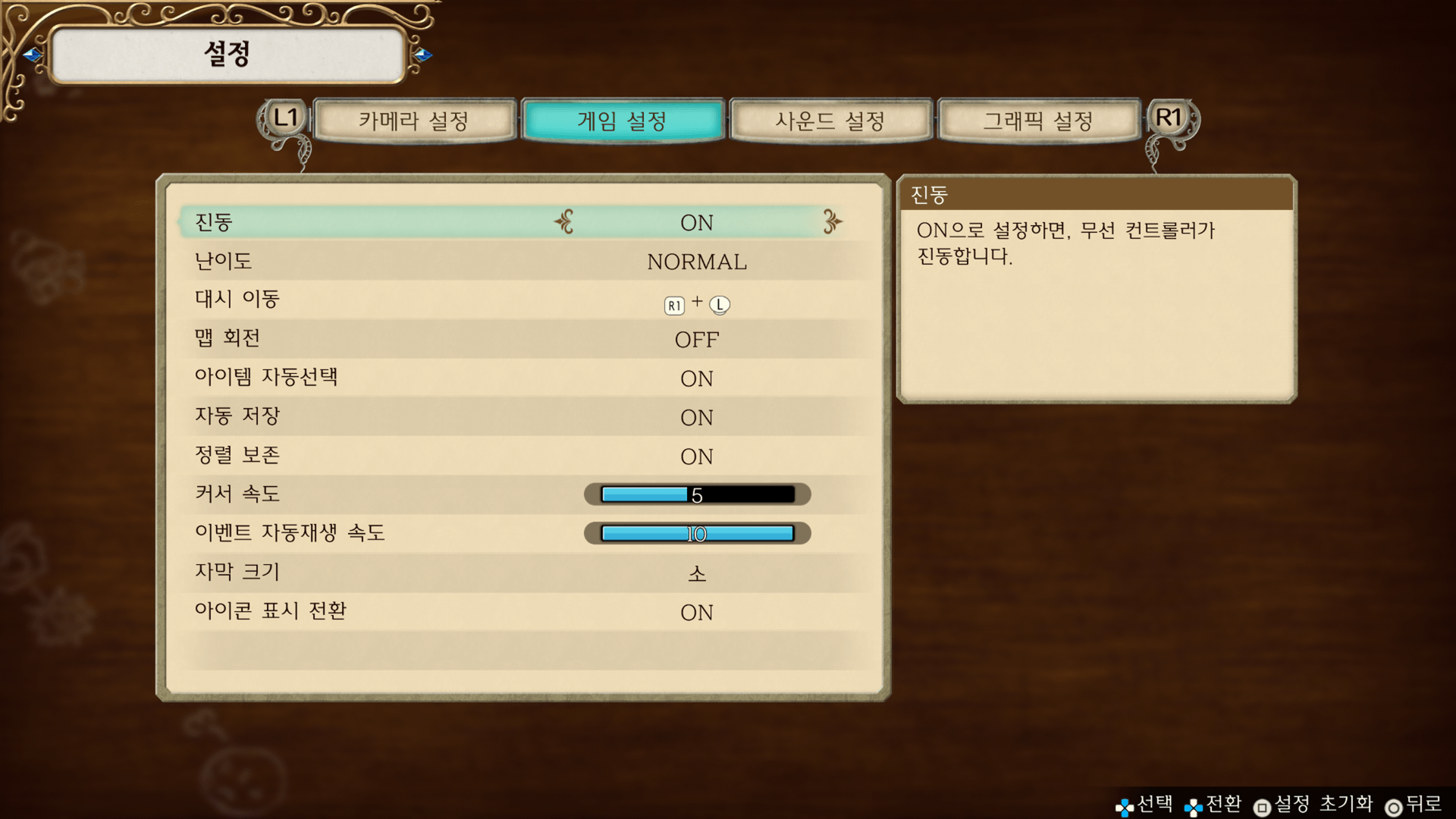 | 진동 | ON으로 설정하면, 컨트롤러가 진동합니다. |