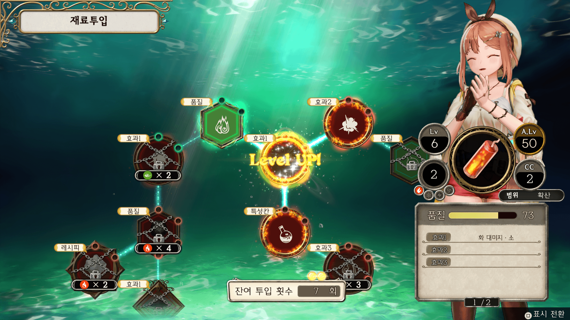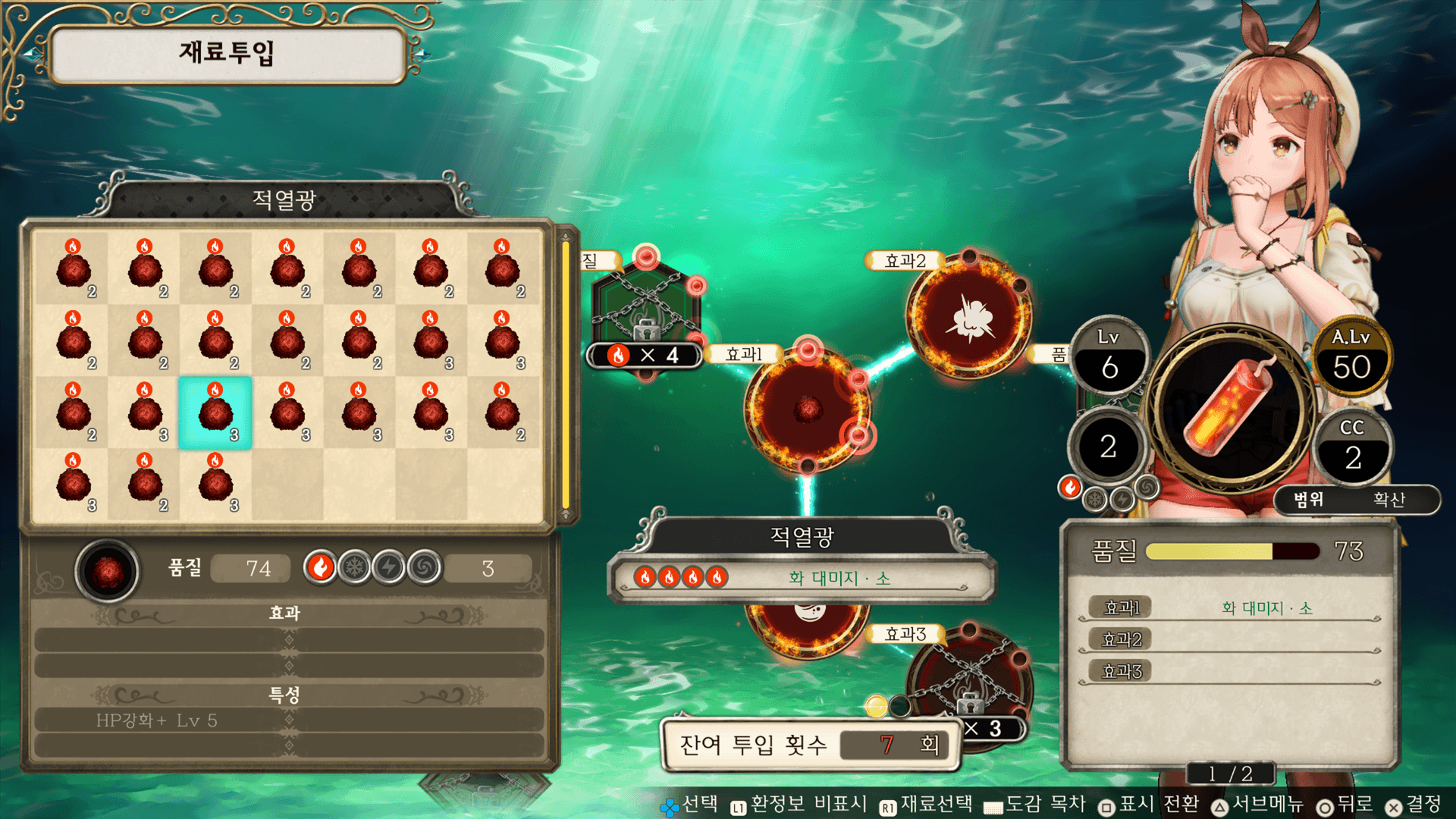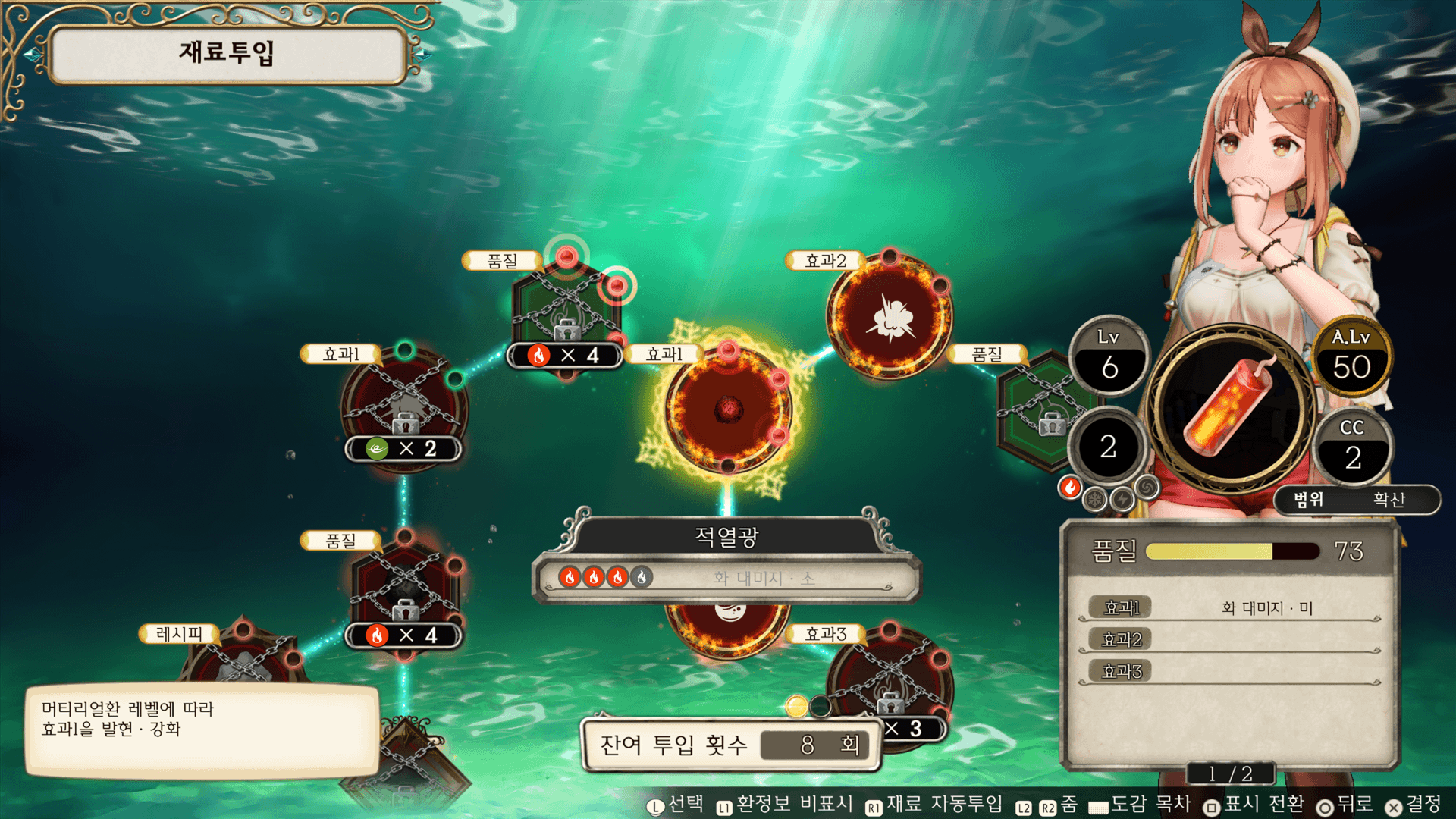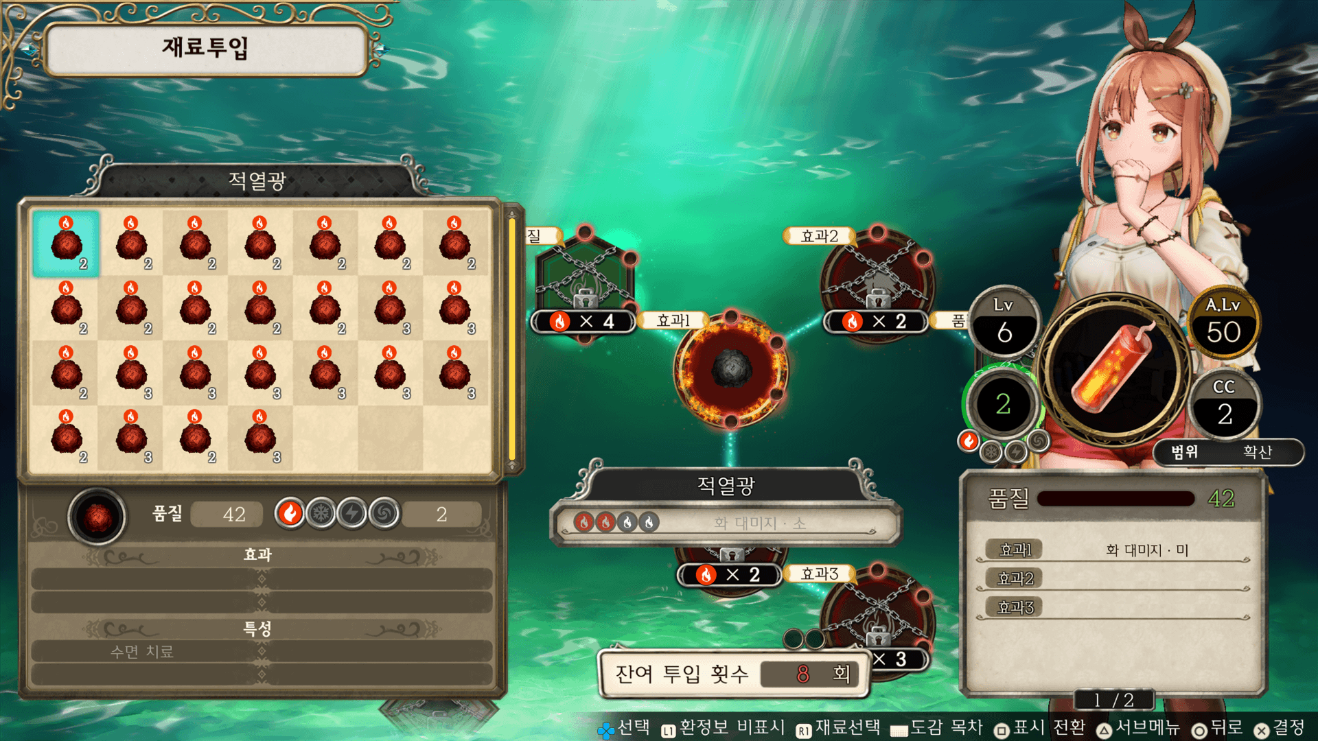 조합은 아틀리에의 연금가마에서 할 수 있습니다. 조합을 하기 위해서는 아이템의 레시피가 필요합니다.