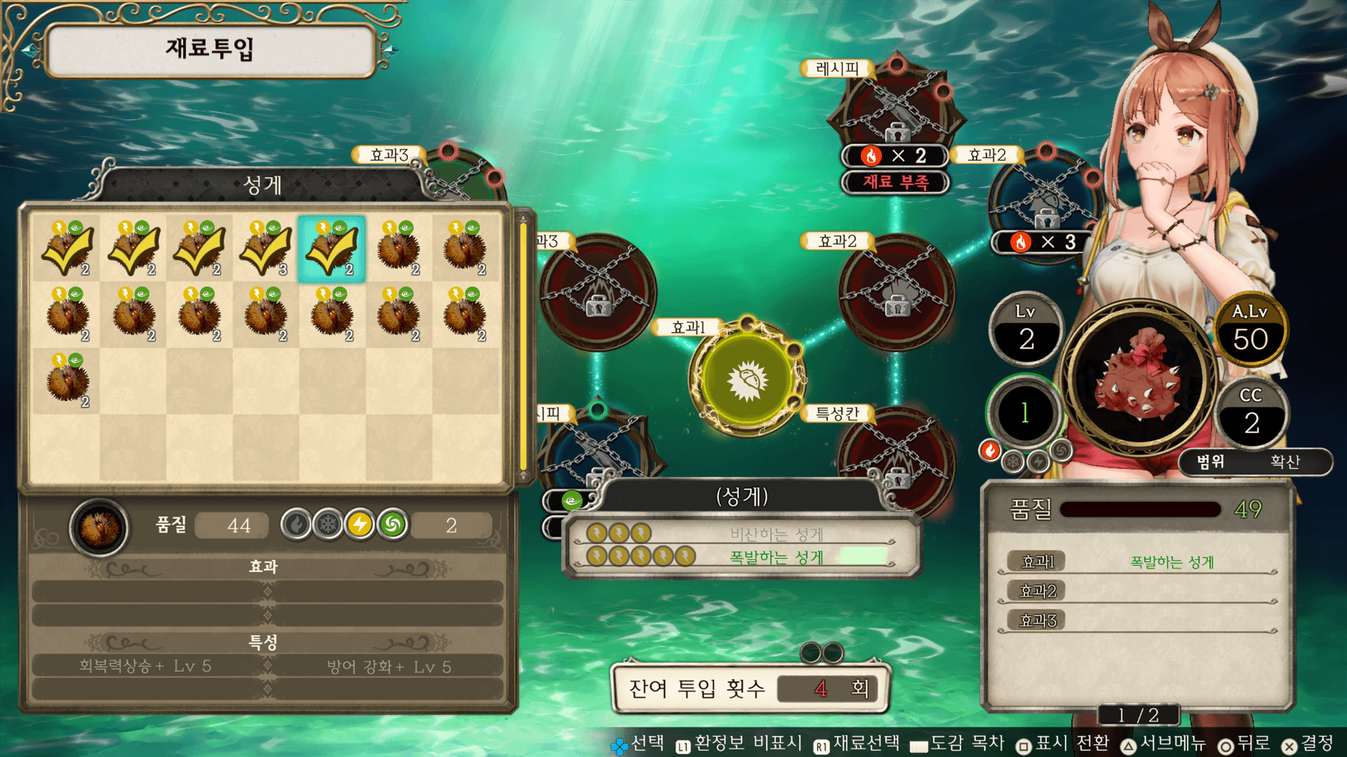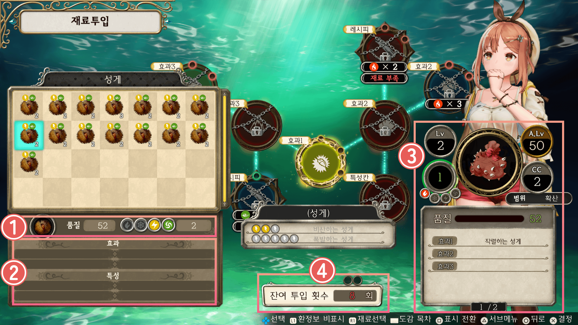 상부의 원의 수는 조합에 필요한 최소 재료 수입니다. 이 원이 모두 노랗게 변하면 투입 횟수가 남아 있는 상태에서도 조합이 가능합니다.