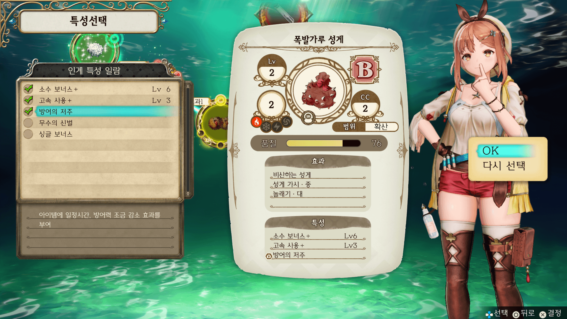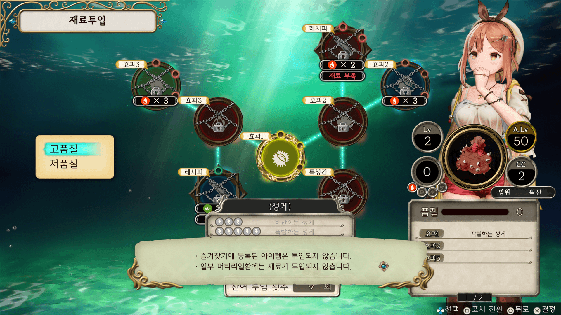 선택 중인 재료의 효과・특성입니다. 아이템의 품질을 높이거나 특성을 인계할 수 있습니다.