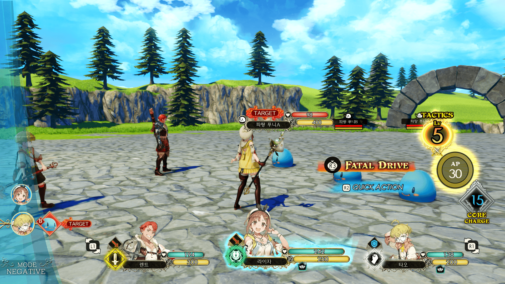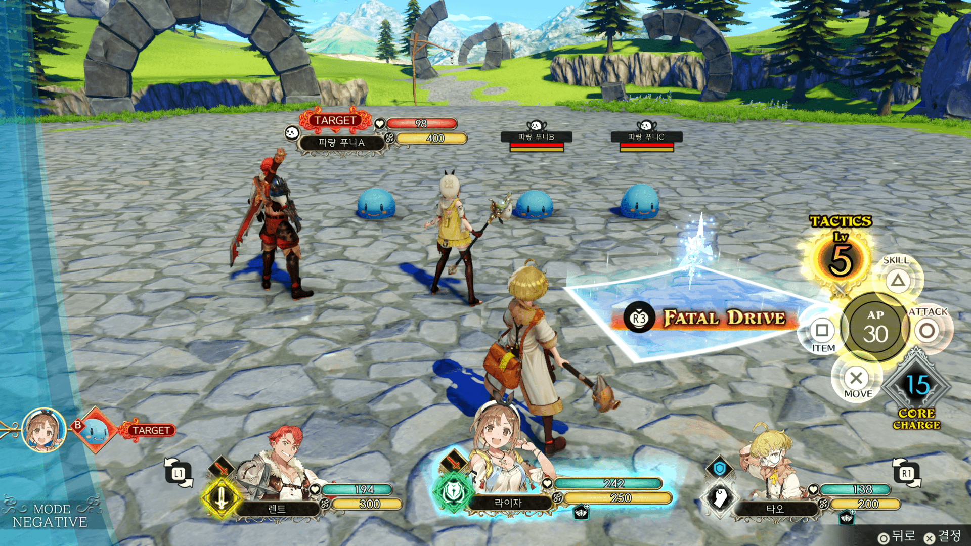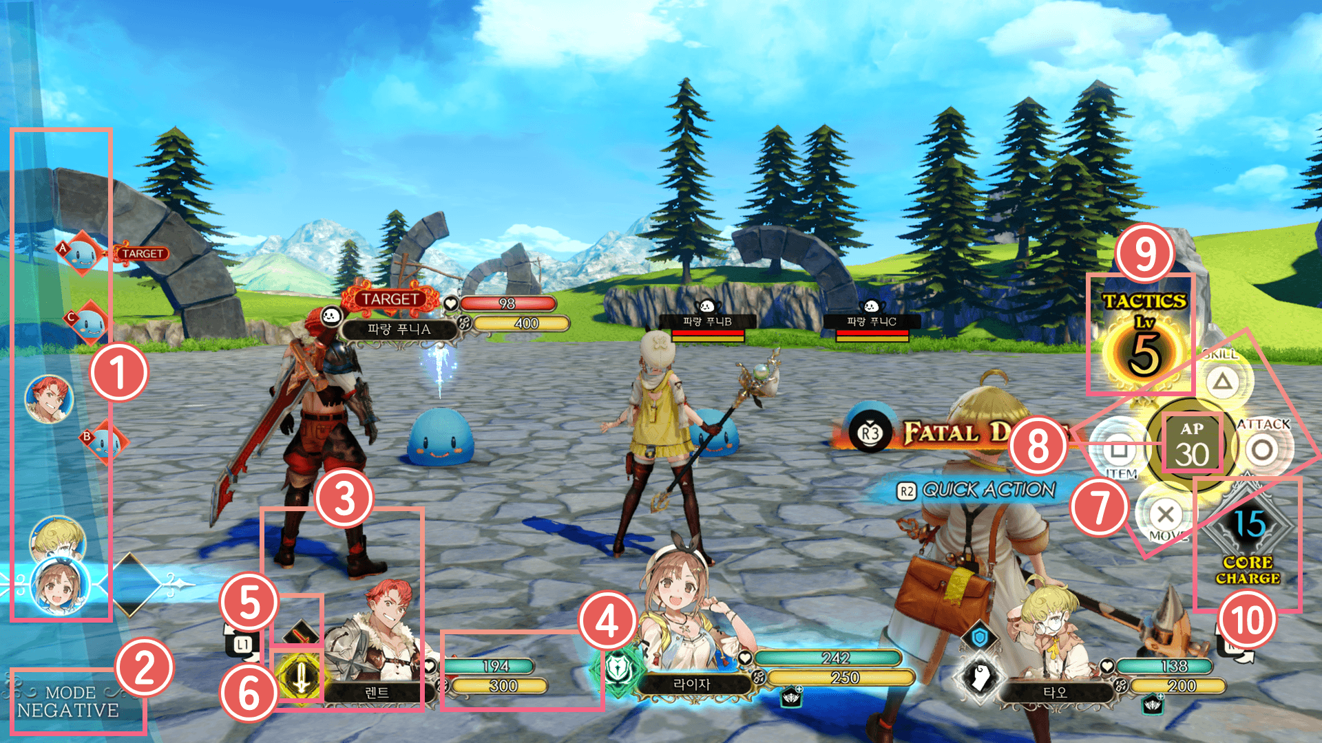 몬스터의 HP를 모두 0으로 만들면 승리합니다. 모든 아군의 HP가 0이 되면 패배하게 되어 아틀리에로 돌아갑니다.