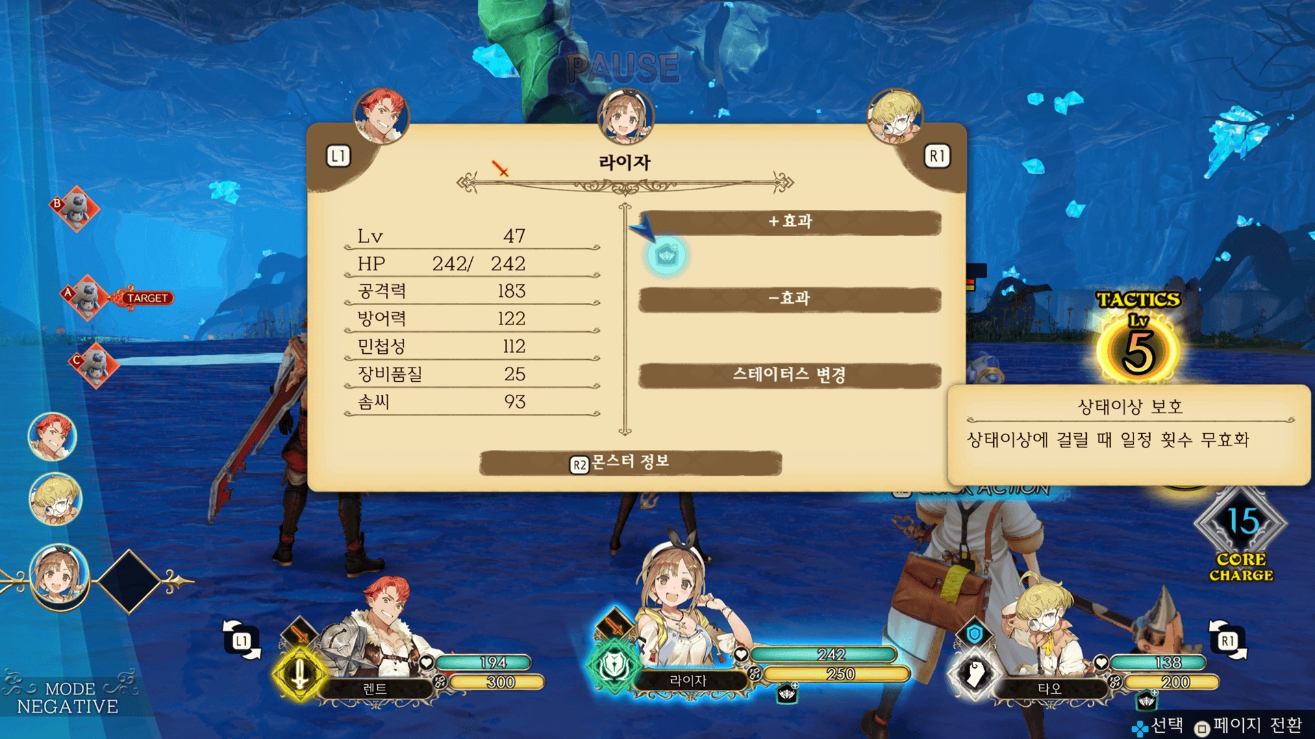 상태이상에는 상승과 저하가 있습니다. 캐릭터의 상태이상은「파티 정보」에서 확인할 수 있습니다.