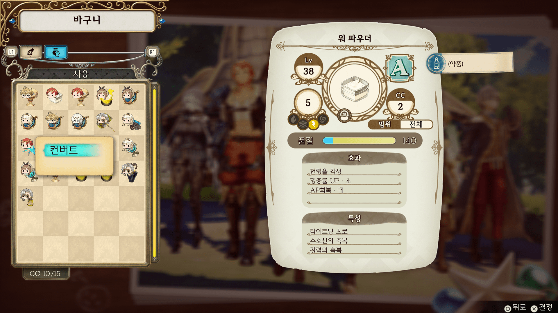 컨버트는 「메인메뉴>바구니ㆍ컨테이너」에서 「컨버트」를 선택, 또는 전투 중에 아이템 선택 화면에서 버튼을 길게 누르면 할 수 있습니다.