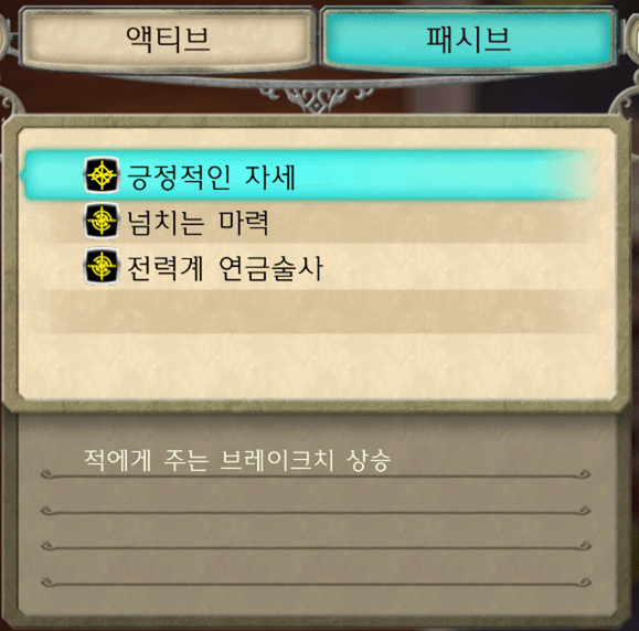 각 캐릭터의 액티브 스킬, 패시브 스킬을 확인할 수 있습니다.